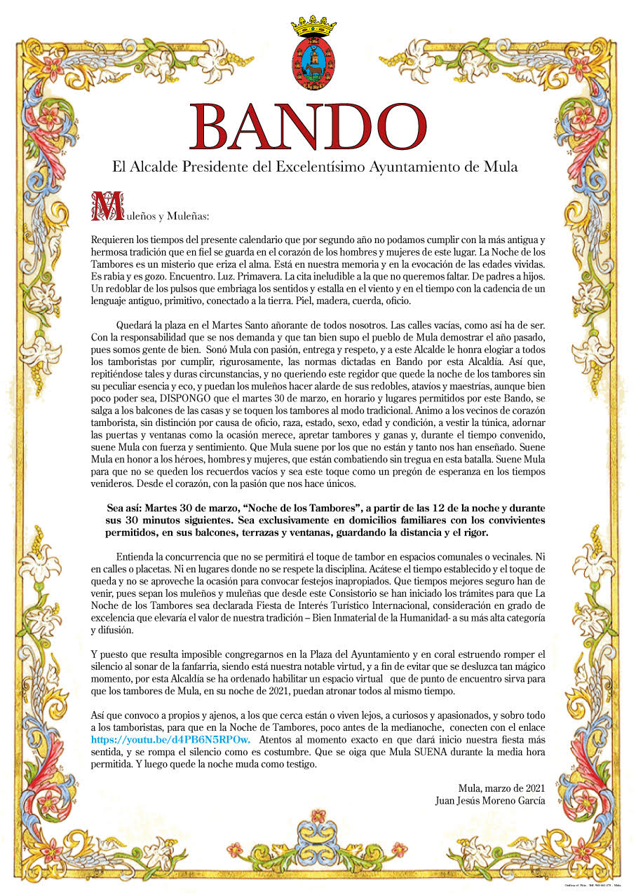 Quedará la plaza en el Martes Santo añorante de todos nosotros. Las calles vacías, como así ha de ser. Con la responsabilidad que se nos demanda y que tan bien supo el pueblo de Mula demostrar el año pasado, pues somos gente de bien. Sonó Mula con pasión, entrega y respeto, y a este Alcalde le honra elogiar a todos los tamboristas por cumplir, rigurosamente, las normas dictadas en Bando por esta Alcaldía. Así que, repitiéndose tales y duras circunstancias, y no queriendo este regidor que quede la noche de los tambores sin su peculiar esencia y eco, y puedan los muleños hacer alarde de sus redobles, atavíos y maestrías, aunque bien poco poder sea, DISPONGO que el martes 30 de marzo, en horario y lugares permitidos por este Bando, se salga a los balcones de las casas y se toquen los tambores al modo tradicional. Animo a los vecinos de corazón tamborista, sin distinción por causa de oficio, raza, estado, sexo, edad y condición, a vestir la túnica, adornar las puertas y ventanas como la ocasión merece, apretar tambores y ganas y, durante el tiempo convenido, suene Mula con fuerza y sentimiento. Que Mula suene por los que no están y tanto nos han enseñado. Suene Mula en honor a los héroes, hombres y mujeres, que están combatiendo sin tregua en esta batalla. Suene Mula para que no se queden los recuerdos vacíos y sea este toque como un pregón de esperanza en los tiempos venideros. Desde el corazón, con la pasión que nos hace únicos.