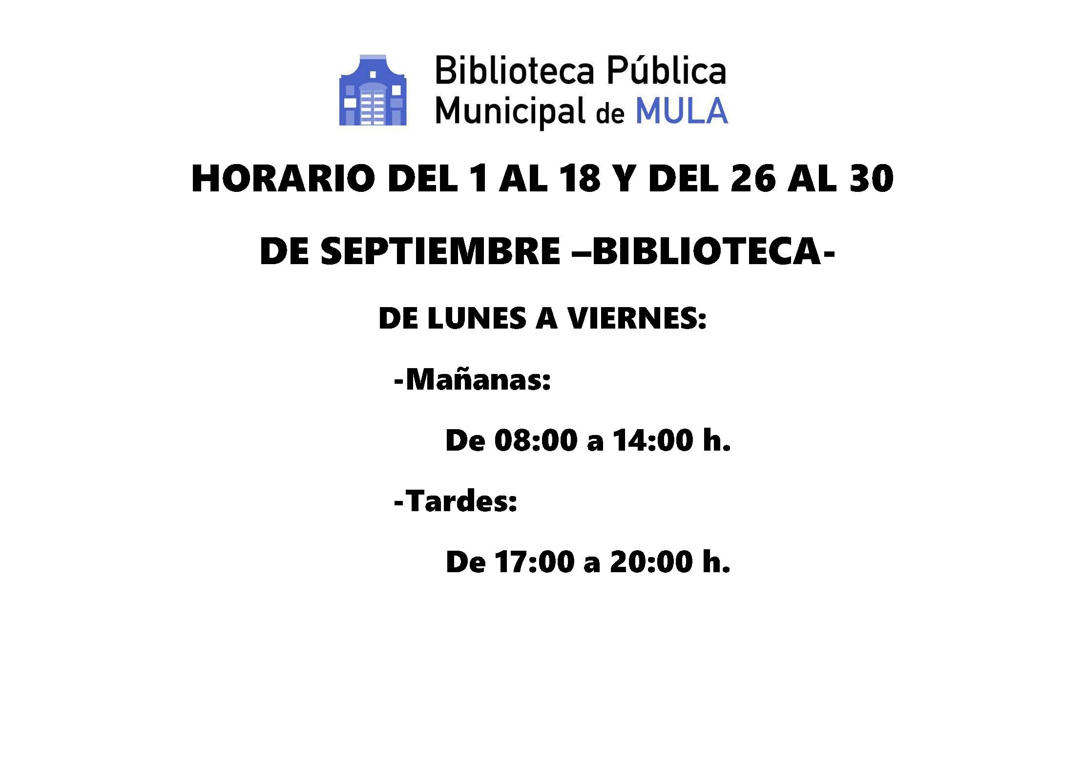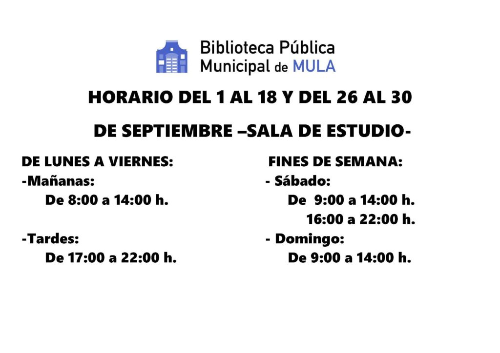 View Larger Image Biblioteca Municipal y Sala de estudio: Horario de septiembre Comparte esto: Comparte en Facebook (Se abre en una ventana nueva) Facebook Compartir en X (Se abre en una ventana nueva) X Compartir en Telegram (Se abre en una ventana nueva) Telegram Compartir en WhatsApp (Se abre en una ventana nueva) WhatsApp Imprimir (Se abre en una ventana nueva) Imprimir Rosario Martínez2021-05-12T20:11:30+02:00lunes, 9 septiembre 2019|biblioteca|