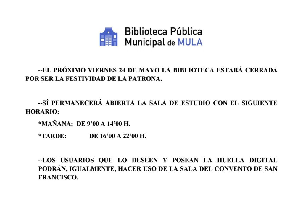 View Larger Image Biblioteca Pública Municipal: Cambio de horario, viernes 24 de mayo Comparte esto: Comparte en Facebook (Se abre en una ventana nueva) Facebook Compartir en X (Se abre en una ventana nueva) X Compartir en Telegram (Se abre en una ventana nueva) Telegram Compartir en WhatsApp (Se abre en una ventana nueva) WhatsApp Imprimir (Se abre en una ventana nueva) Imprimir Rosario Martínez2021-05-12T20:11:53+02:00miércoles, 22 mayo 2019|biblioteca|