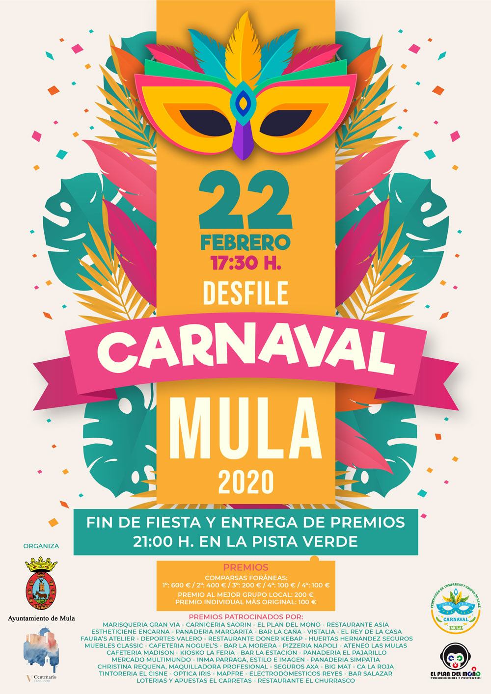 La Concejalía de Festejos se complace en presentar el cartel del Carnaval 2020, colorista y alegre. Mula apuesta por hacer grande su carnaval en consonancia con la calidad de sus comparsas y la generosidad de sus comercios. Este año con nuevo recorrido, concurso de comparsas foráneas y premio al mejor grupo y disfraz individual. Esta es la programación y las novedades para este año: