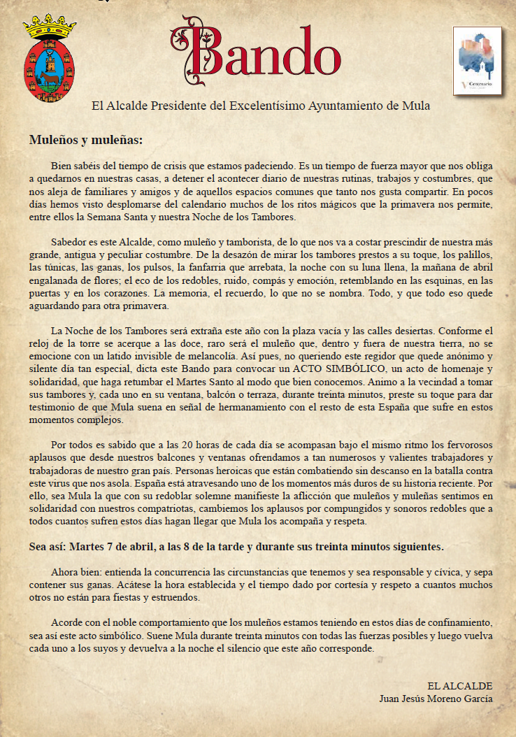 Gracias a las reposiciones de mulaTV y FibraMed en su canal Youtube, se van a poder revivir en una lista hecha al efecto por el Canal TIC del Ayuntamiento de Mula las procesiones de 2019, la tamborada infantil y La Noche de los Tambores 2019. Lista de vídeos de Semana Santa y Tambores 2019 [...]