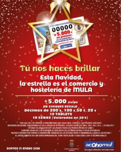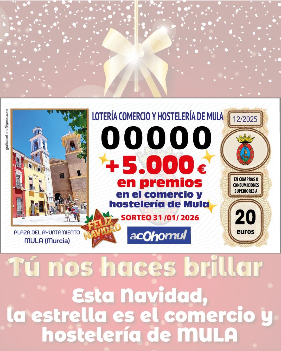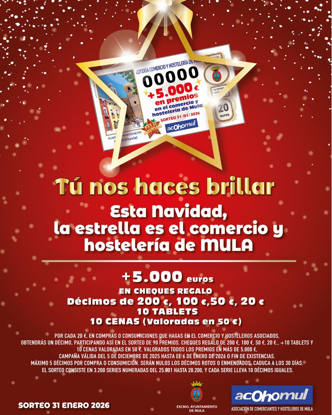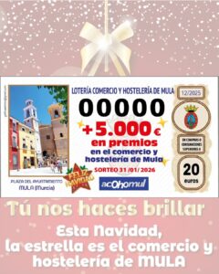 Al igual que el pasado año, cada cliente recibirá un décimo gratuito de la Lotería del Comercio y la Hostelería de Mula por cada compra o consumición igual o superior a 20 euros en los establecimientos adheridos. Una iniciativa que fomenta el consumo local durante la Navidad y premia la fidelidad de los ciudadanos.