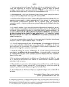 - Los cuentos premiados podrán ser editados por el Ayuntamiento de Mula. Y en caso de su edición por los autores, éstos habrán de mencionar en la misma el premio obtenido en este certamen.