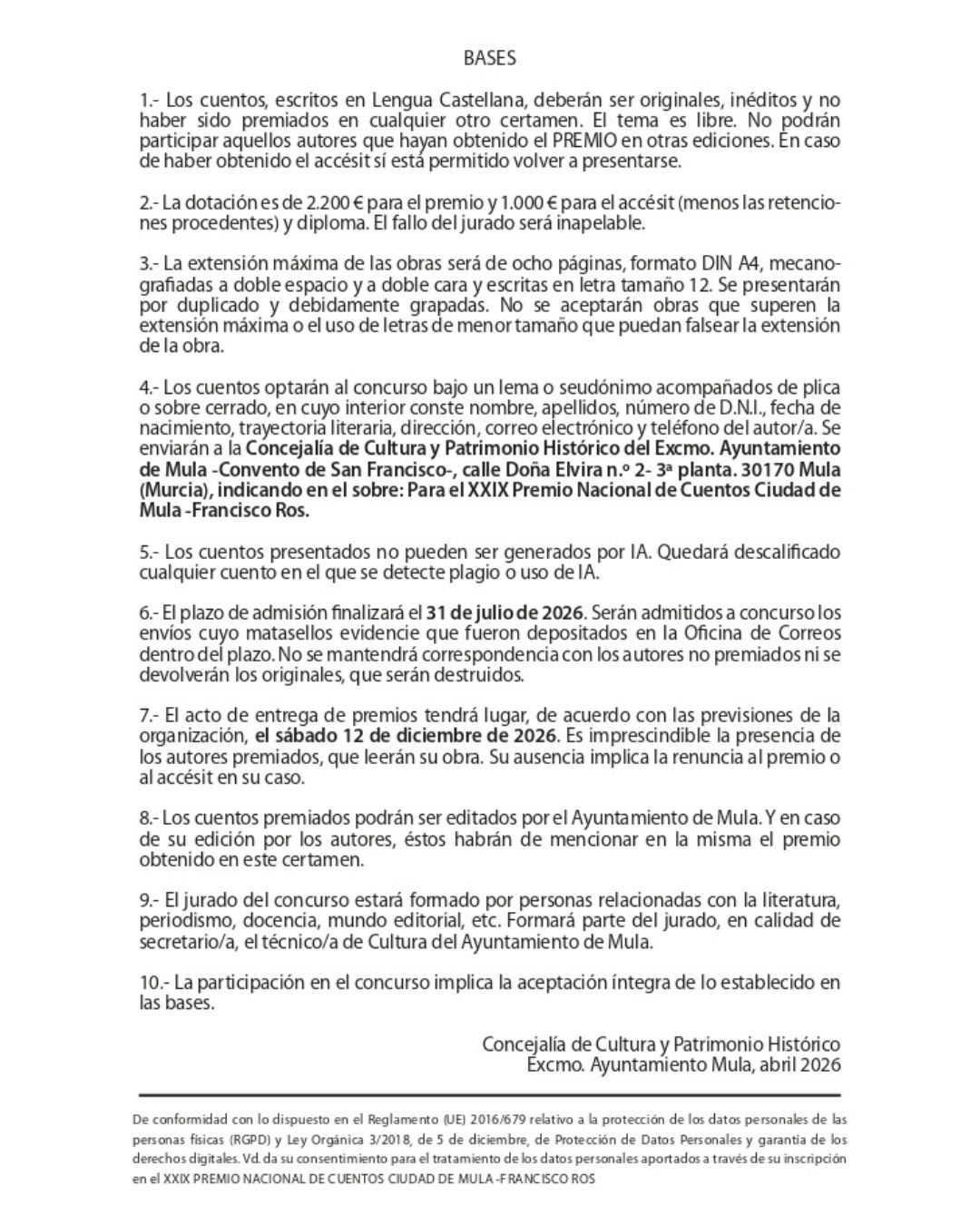 Bases del XXIX Premio Nacional de Cuentos Ciudad de Mula – Francisco Ros