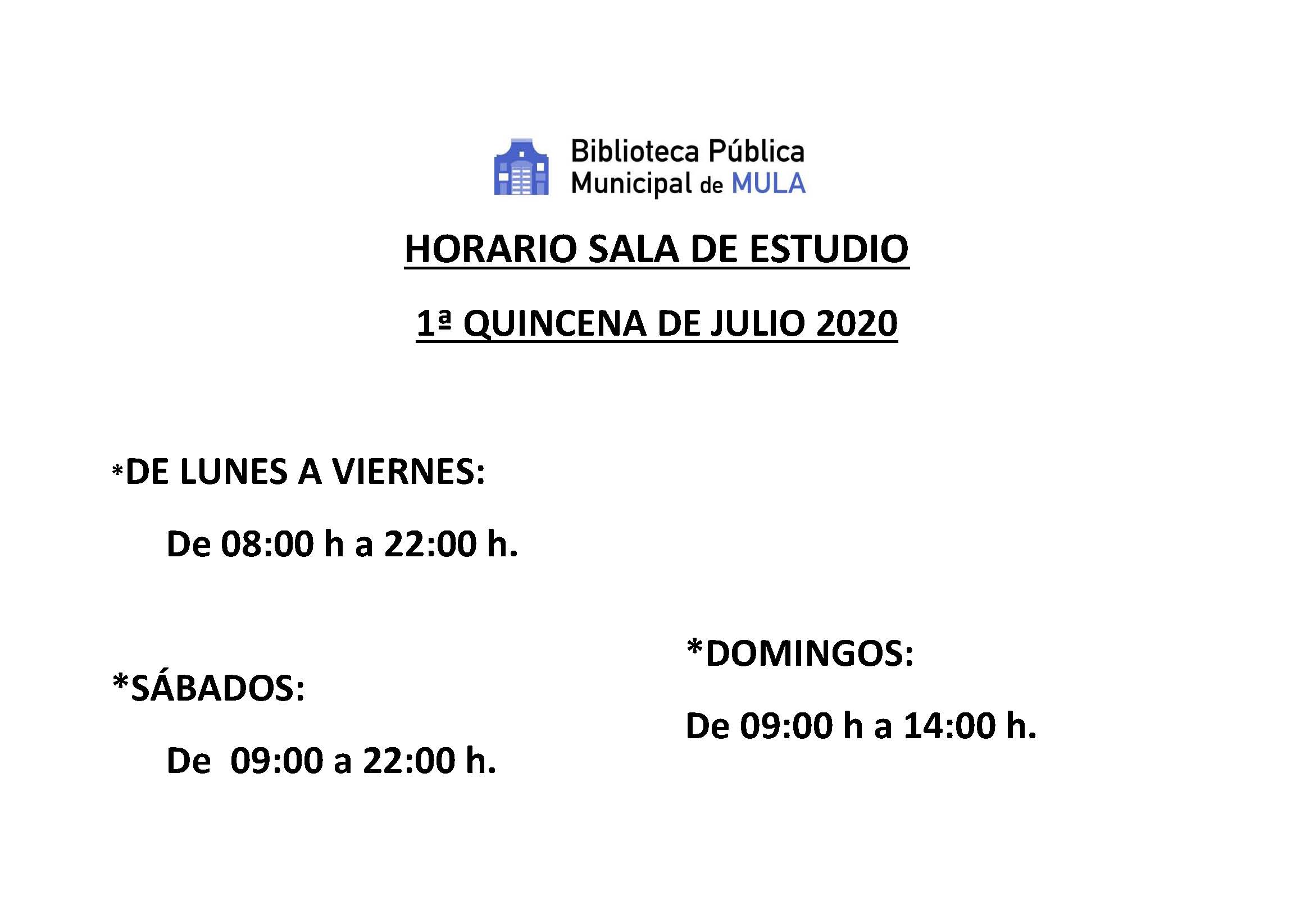 View Larger Image CULTURA | Biblioteca municipal y sala de estudio: Horario 1ª quincena de julio Horario biblioteca – 1ª quincena julio 2020 (.pdf) Horario sala de estudio – 1ª quincena julio 2020 (.pdf) Comparte esto: Comparte en Facebook (Se abre en una ventana nueva) Facebook Compartir en X (Se abre en una ventana nueva) X Compartir en Telegram (Se abre en una ventana nueva) Telegram Compartir en WhatsApp (Se abre en una ventana nueva) WhatsApp Imprimir (Se abre en una ventana nueva) Imprimir Rosario Martínez2021-05-12T20:09:06+02:00jueves, 2 julio 2020|biblioteca, cultura|