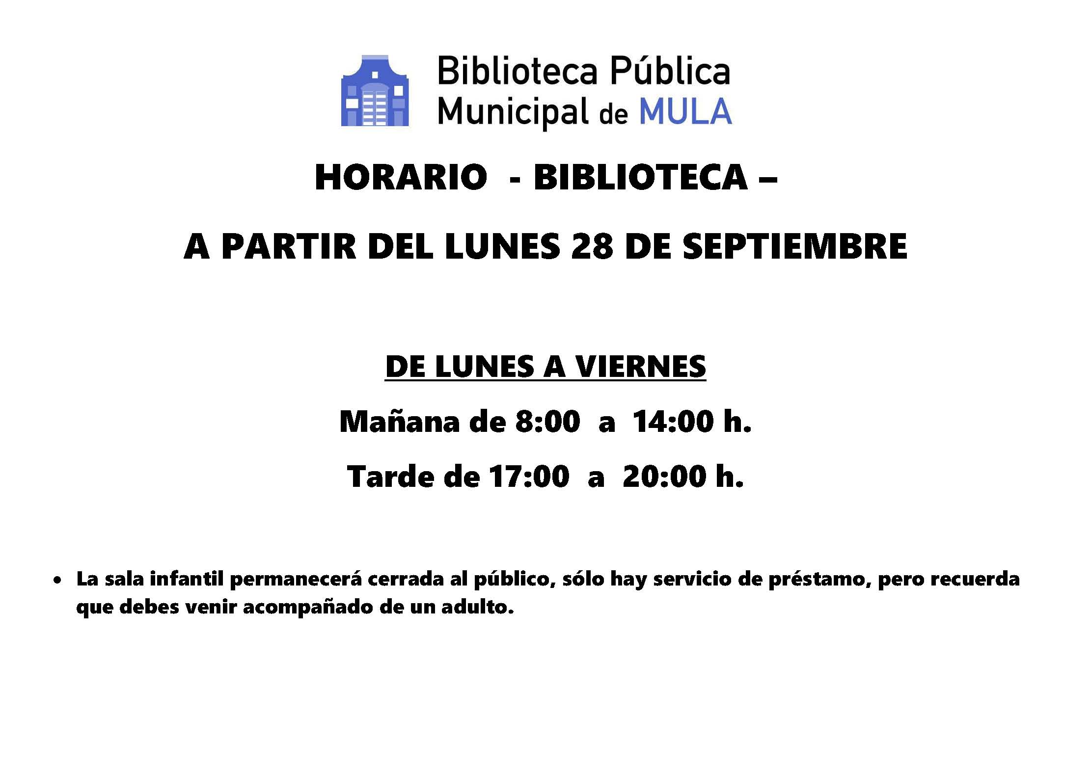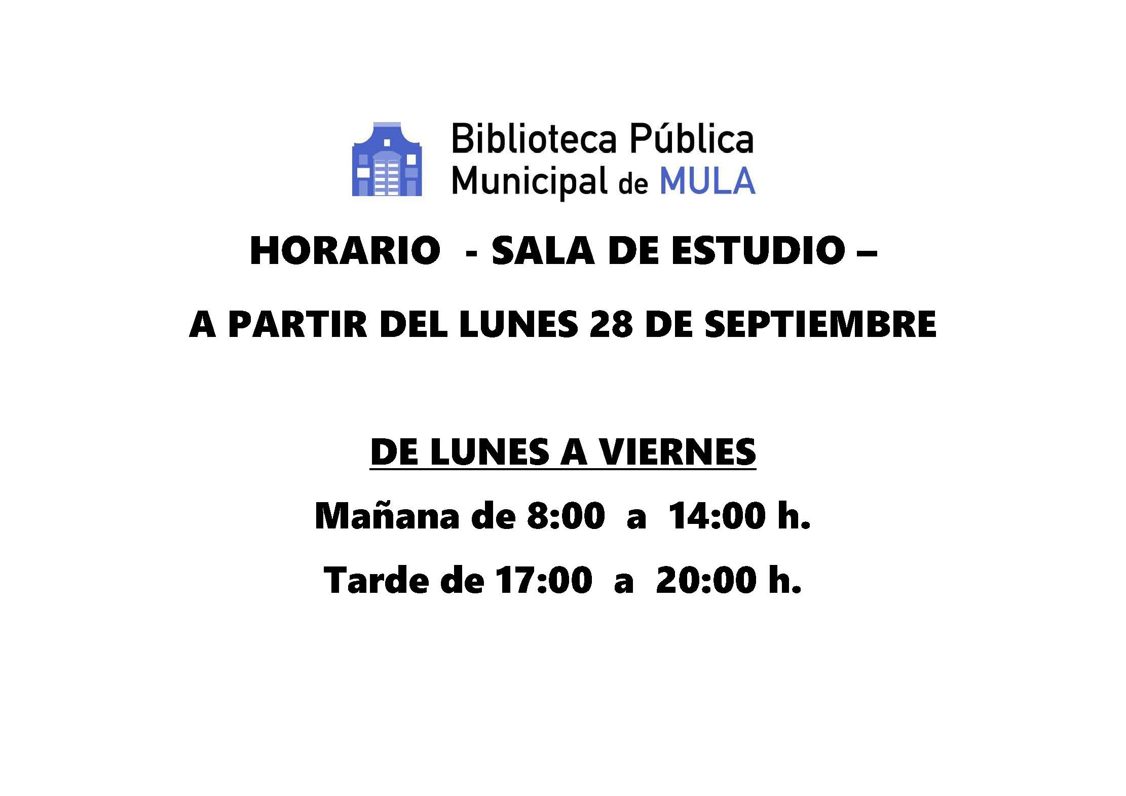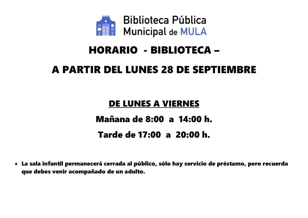View Larger Image CULTURA | Biblioteca Pública Municipal de Mula: Horario de la biblioteca y sala de estudio – Octubre 2020 Comparte esto: Comparte en Facebook (Se abre en una ventana nueva) Facebook Compartir en X (Se abre en una ventana nueva) X Compartir en Telegram (Se abre en una ventana nueva) Telegram Compartir en WhatsApp (Se abre en una ventana nueva) WhatsApp Imprimir (Se abre en una ventana nueva) Imprimir Rosario Martínez2021-05-12T20:08:16+02:00viernes, 25 septiembre 2020|biblioteca, cultura|