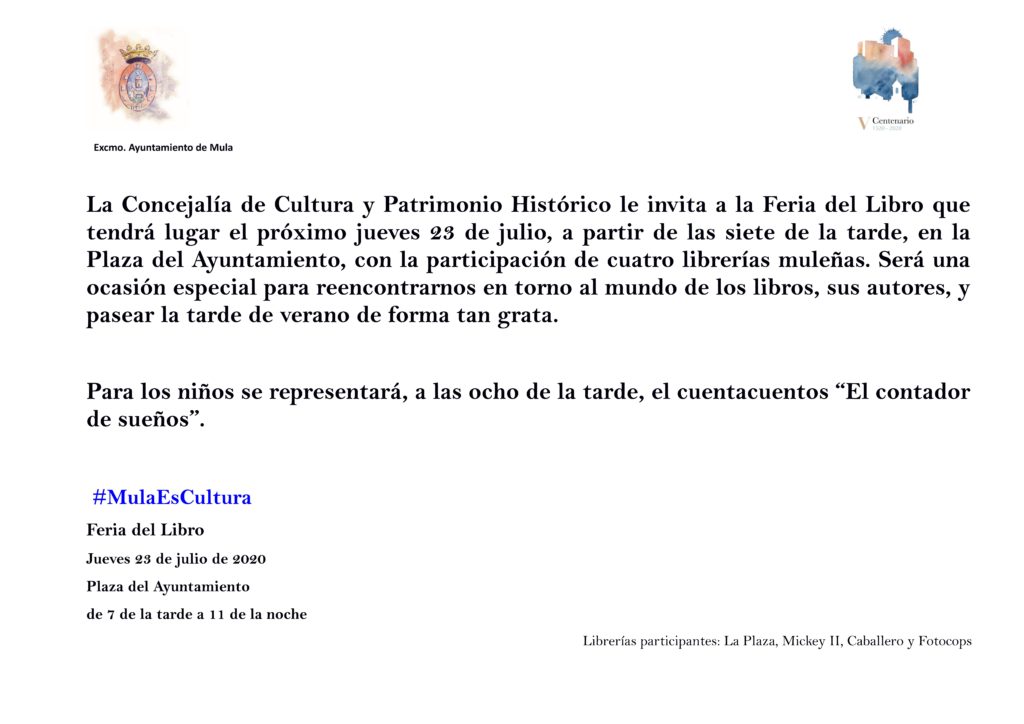 View Larger Image CULTURA | Feria del Libro – 23 de julio Comparte esto: Comparte en Facebook (Se abre en una ventana nueva) Facebook Compartir en X (Se abre en una ventana nueva) X Compartir en Telegram (Se abre en una ventana nueva) Telegram Compartir en WhatsApp (Se abre en una ventana nueva) WhatsApp Imprimir (Se abre en una ventana nueva) Imprimir Rosario Martínez2021-05-12T20:09:02+02:00lunes, 20 julio 2020|cultura|
