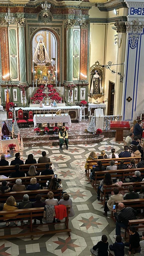 El elenco de la representación teatral, realizada en la ermita del Carmen, ha estado compuesto por el grupo infantil de la Peña Huertana Los Muleñicos y usuarios de la Asociación Intedis de Mula. La obra ha contado con una gran asistencia de público y ha tenido carácter solidario, ya que cada asistente ha entregado alimentos no perecederos destinados a Cáritas a modo de entrada simbólica.