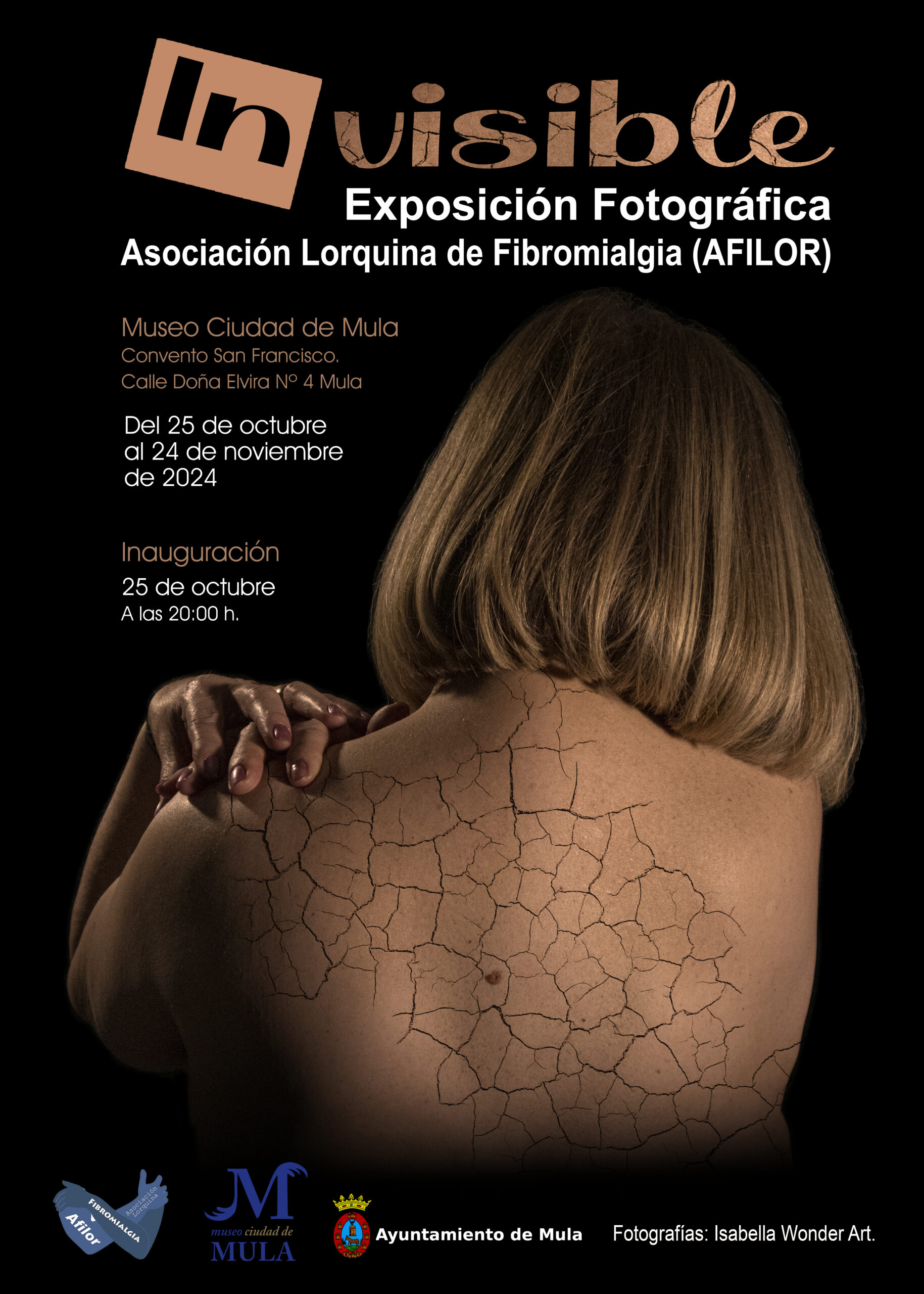 Mula, 23 de octubre de 2024 – El próximo viernes 25 de octubre a las 20:00 horas se inaugurará en el Museo Ciudad de Mula la exposición fotográfica «Invisibles», organizada por la Asociación Lorquina de Fibromialgia (AFILOR) con la colaboración de las concejalías de Cultura e Igualdad del Ayuntamiento de Mula.