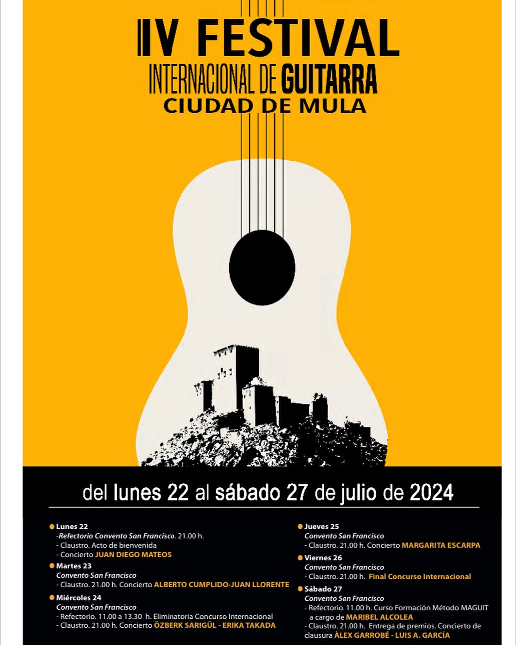 - Gala de entrega de premios y concierto de clausura a cargo de Àlex Garrobé, renombrado guitarrista español, presente en todas las ediciones del festival, y Luis Alejandro García, joven talento canario, con más de cuarenta concursos ganados a su nombre. Ambos estrenarán su dúo musical en Mula.