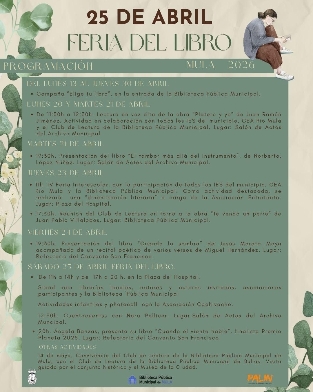 Con esta programación, el Día del Libro se convierte en una oportunidad para llenar Mula y sus pedanías de historias, encuentros y participación, reivindicando la lectura como un espacio compartido que enriquece y fortalece la vida cultural del municipio.