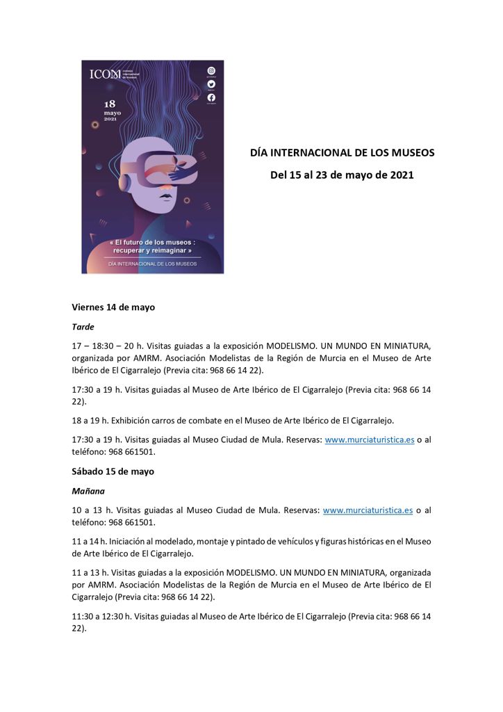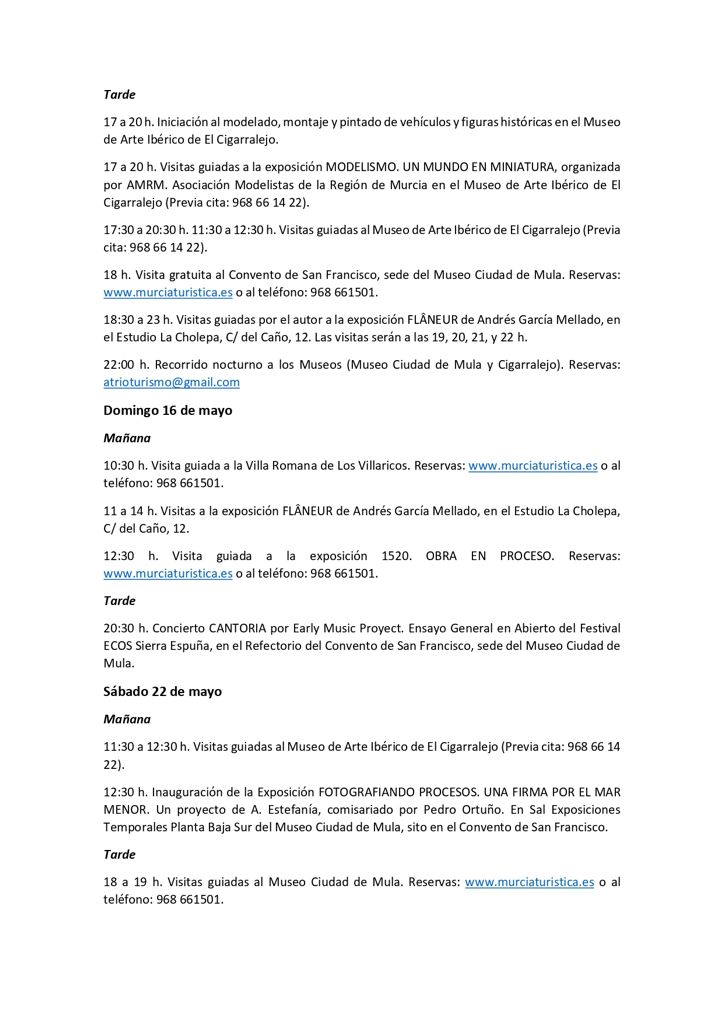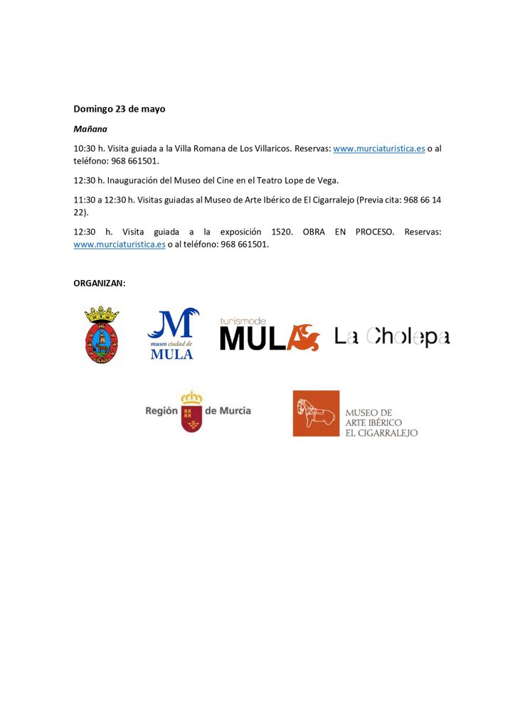 Así, entre los días 15 y 23 de mayo se realizarán diversas actividades relacionadas con los Museos y el Patrimonio Histórico de Mula, así como numerosas actividades culturales en el Museo Ciudad de Mula, ubicado en el Convento San Francisco, así como en el Museo de Arte Ibérico El Cigarralejo y en el Estudio de La Cholepa.