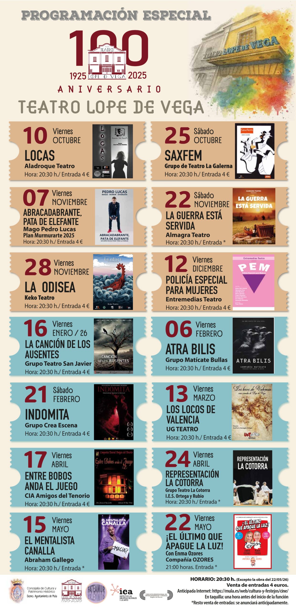 Con este ciclo, Mula invita a vecinos y visitantes a sumarse a la celebración de los 100 años del Teatro Lope de Vega, un espacio que continúa siendo símbolo de cultura, tradición y futuro compartido.