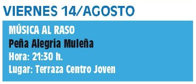 El próximo viernes 14 de agosto, a las 21.30 horas, continuamos con la serie de conciertos y recitales MÚSICA AL RASO a cargo de peñas y asociaciones muleñas dedicadas a la música.