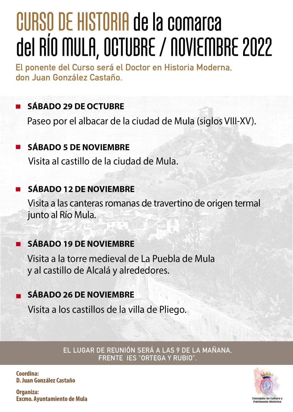 A partir del sábado 29 de octubre y hasta el sábado día 26 de noviembre, Curso de Historia de la Comarca del Río Mula donde descubrir la historia de Mula, sus pedanías y pueblos vecinos acompañados por el Doctor en Historia Moderna Juan González Castaño.