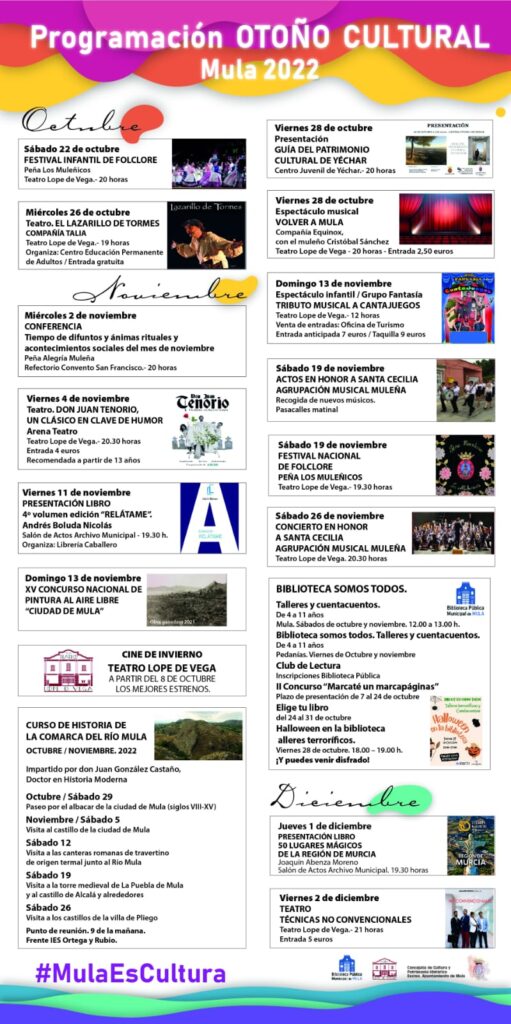 Así durante el mes de octubre, Festival Infantil de Folclore Peña Los Muleñicos el sábado 22; la representación de El Lazarillo de Tormes organizado por el Centro de Educación de Adultos el miércoles 26, o la presentación en el Centro Juvenil de Yéchar de la Guía del Patrimonio Cultural de Yéchar o un espectáculo musical ‘Volver a Mula’ en el Teatro Lope de Vega el día 28.