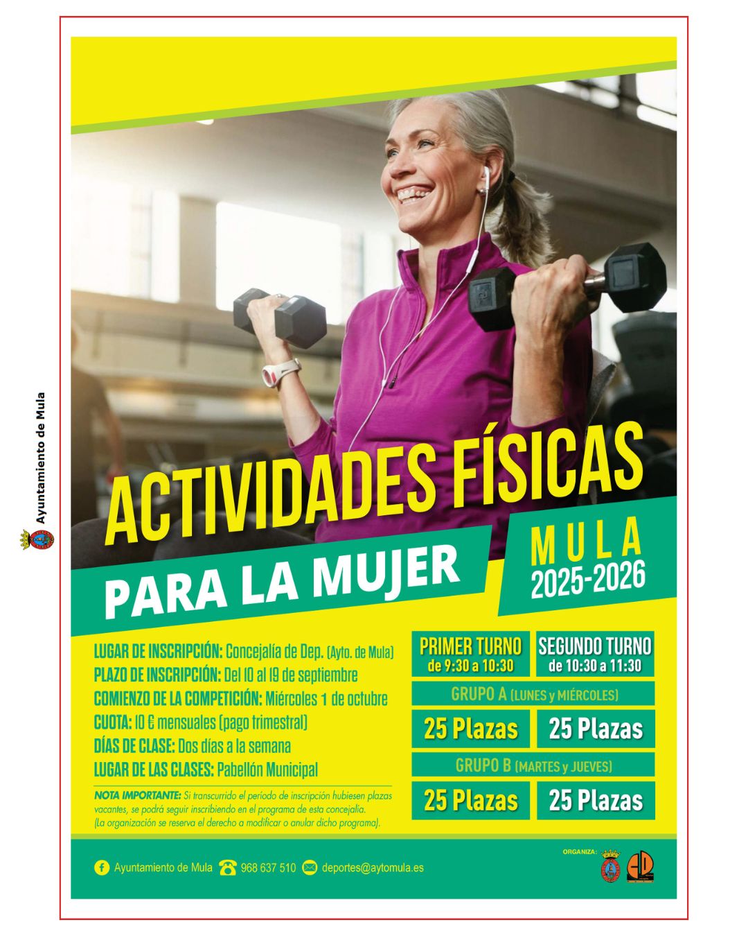 Las inscripciones para todas las actividades estarán abiertas del 10 al 19 de septiembre y podrán formalizarse en la concejalía de Deportes (planta baja del Ayuntamiento de Mula) o a través de la APP Sporttia.