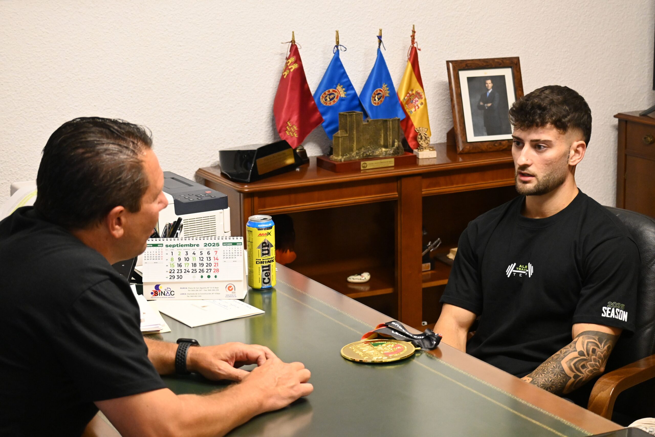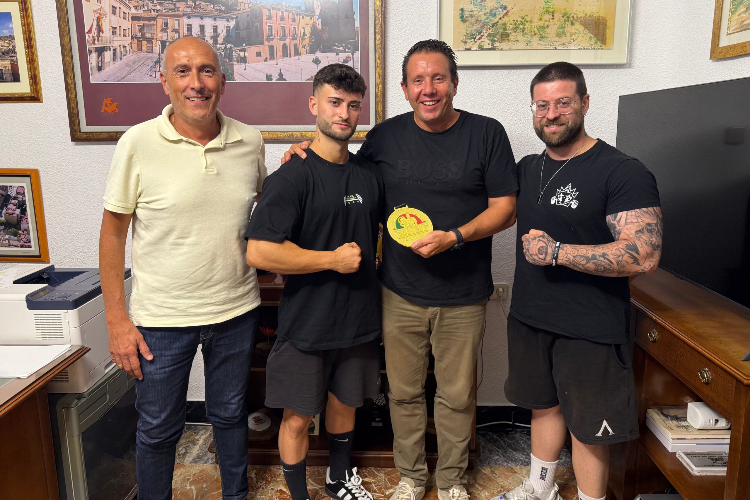 El alcalde de Mula y el concejal de Deportes, Vicente López, han recibido hoy en el Ayuntamiento a Felipe Cabrera De la Cruz, recientemente proclamado Campeón Internacional de la WNBF de Culturismo Natural, en el campeonato celebrado en Portugal. En el acto también estuvo presente su hermano, el muleño Pedro José Cabrera, quien lo acompaña en este camino deportivo.