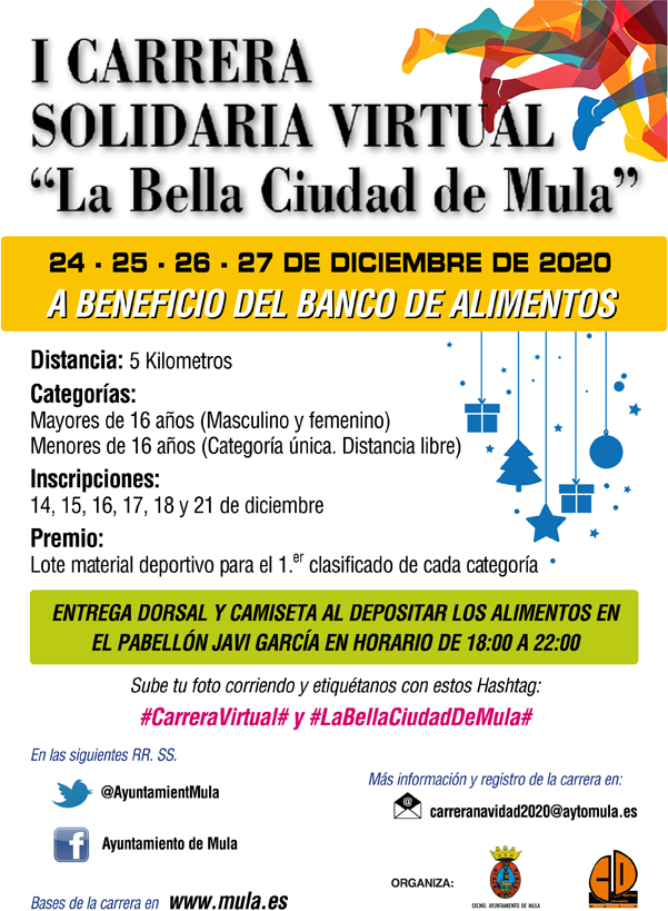 La Concejalía de Deportes del Excmo. Ayuntamiento de Mula, presenta la I Carrera Solidaria “La Bella Ciudad de Mula” siendo la primera edición en formato virtual. Un formato innovador debido a la situación extraordinaria del Covid-19, hará que todas las personas puedan participar en la carrera respetando las medidas de seguridad y promoviendo el deporte.