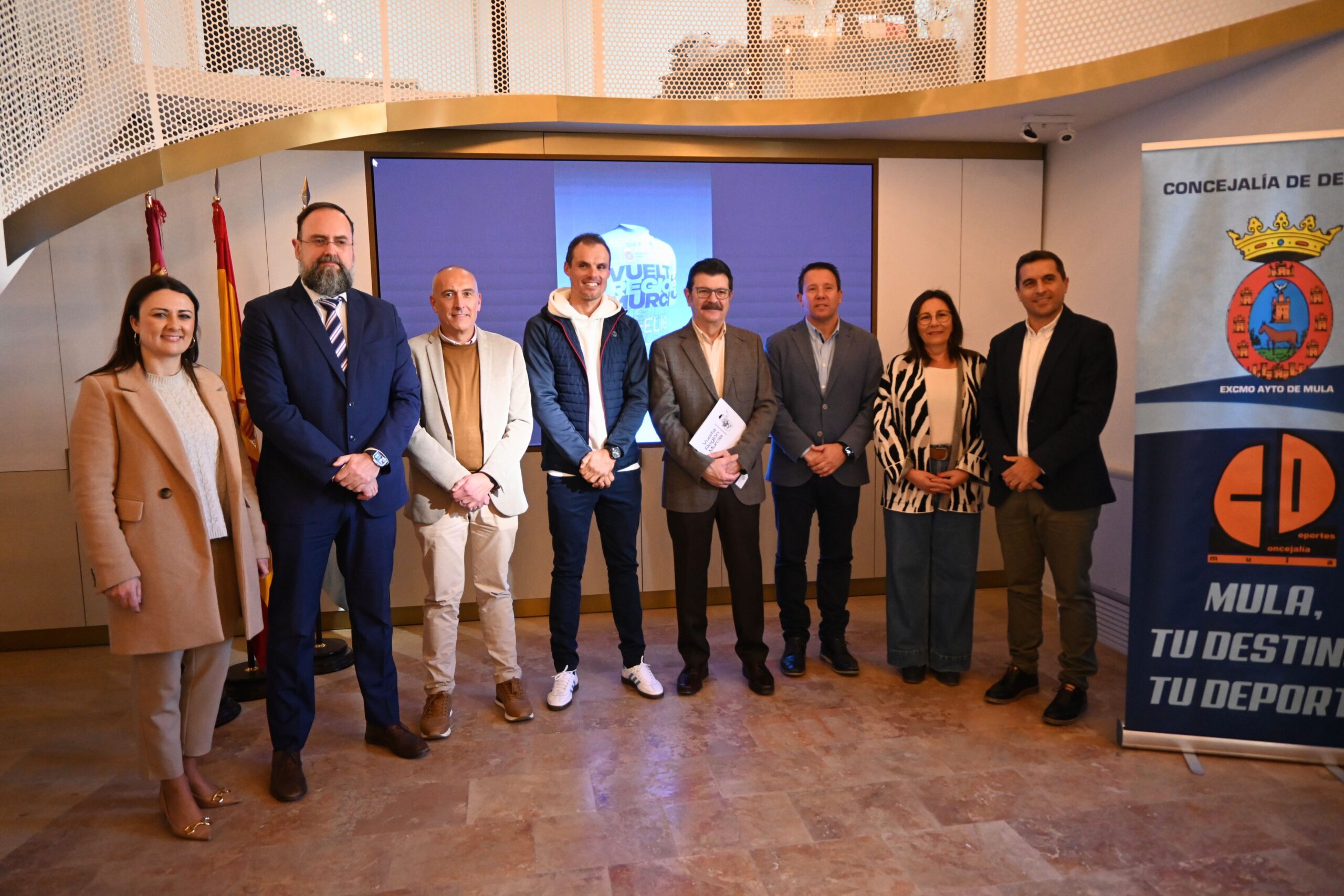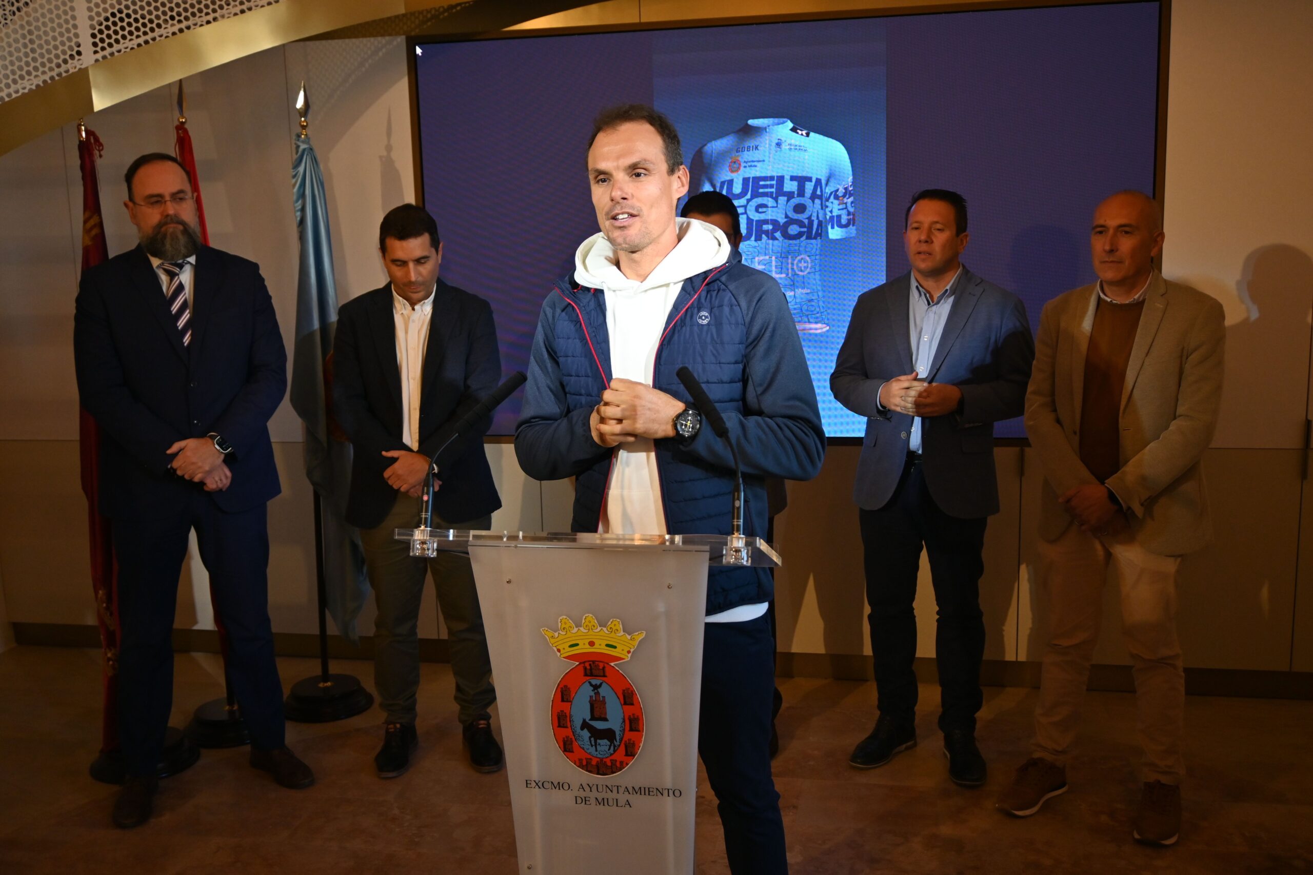 Esta mañana, el alcalde de Mula, Juan Jesús Moreno, acompañado por el concejal de Deportes, Vicente López, representantes de la Caja Rural Central y X-Elio, y el presidente de la Vuelta Ciclista de la Región de Murcia, Francisco Guzmán, han presentado el Maillot de la Combatividad Luis León Sánchez de la Vuelta Ciclista de la Región de Murcia 2025.