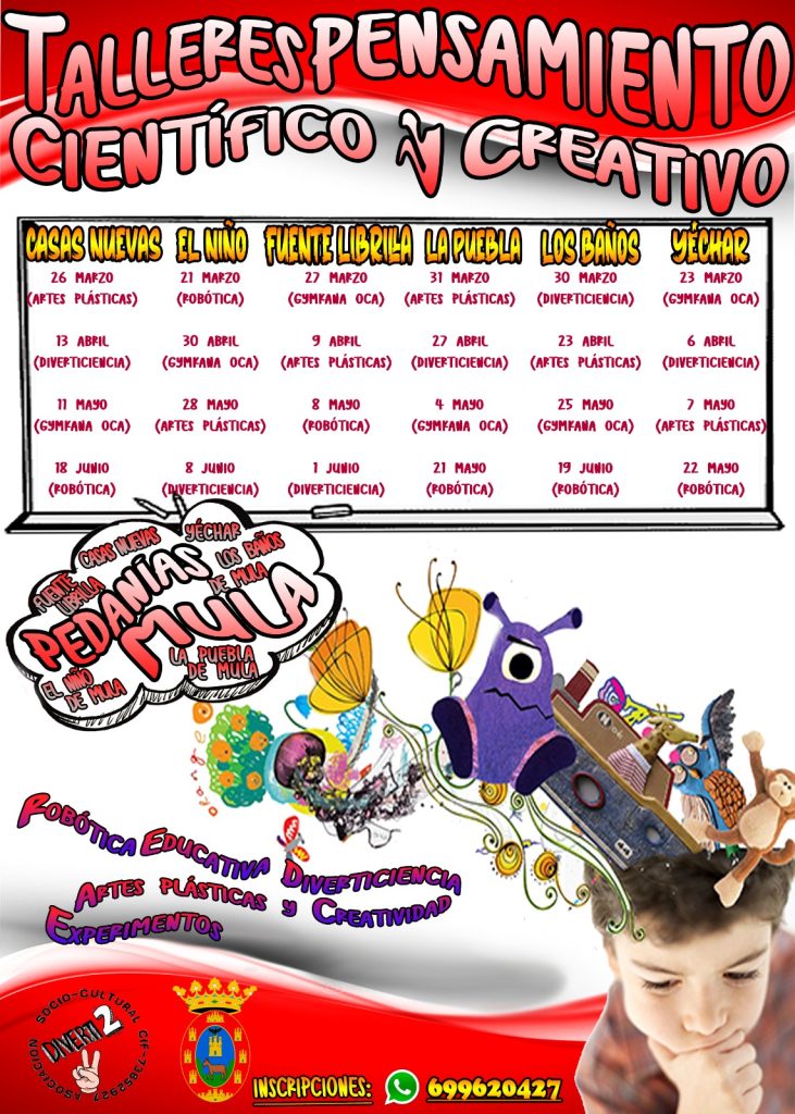 Creación artística, ciencia, robótica y ludicidad son los talleres que contribuirán a estimular el desarrollo del pensamiento creativo, crítico y científico, que arrancarán a finales del mes de marzo en colaboración con las Juntas Vecinales y los alcaldes y alcaldesas pedáneas de El Niño de Mula, Los Baños de Mula, Yéchar, Casas Nuevas, la Puebla de Mula y Fuente Librilla.