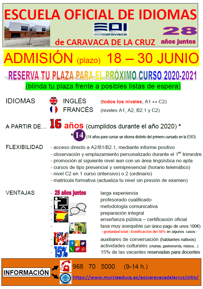 Información: 968 70 5000 (9-14 h.), https://www.murciaeduca.es/eoicaravacadelacruz/sitio/