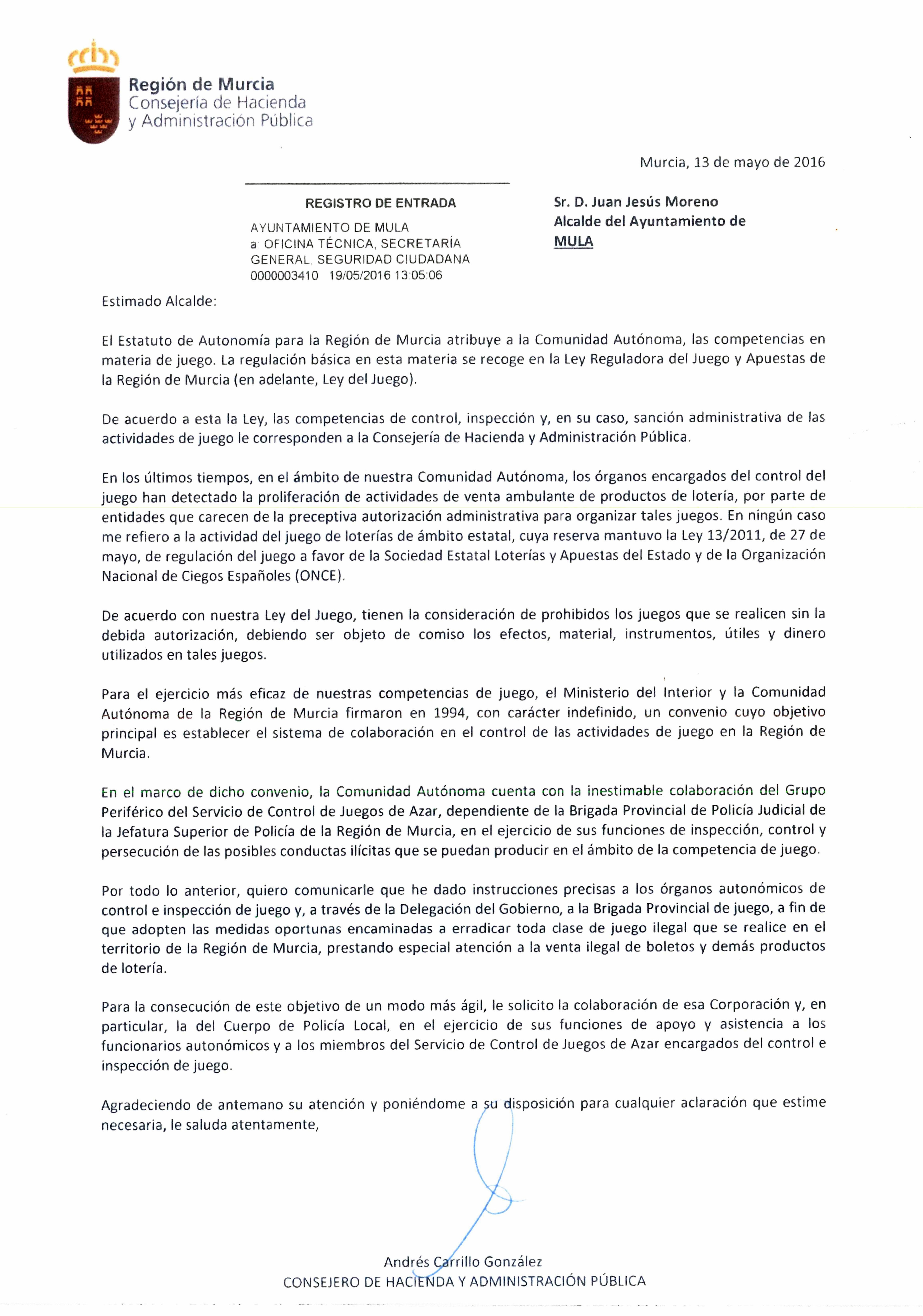El Ayuntamiento de Mula comparte la preocupación de los vecinos por el crecimiento desmesurado y sin ninguna regulación del sector del juego en la Región de Murcia y continuaremos trabajando para que, a la mayor brevedad posible, el Gobierno de la Comunidad Autónoma tome las medidas normativas y legislativas necesarias para una mayor regulación y control de los salones de juegos y apuestas.