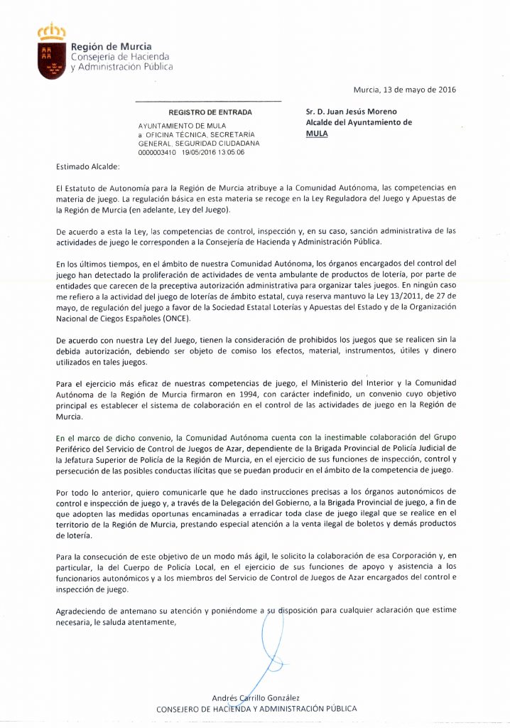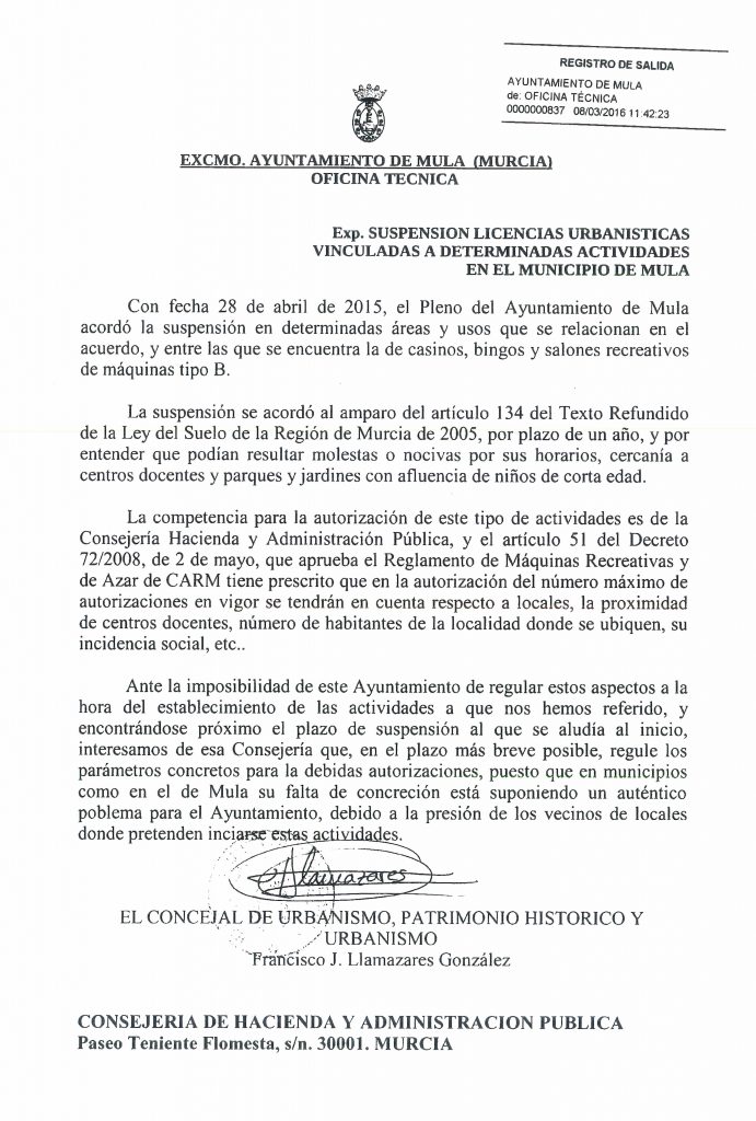 El Ayuntamiento de Mula comparte la preocupación de los vecinos por el crecimiento desmesurado y sin ninguna regulación del sector del juego en la Región de Murcia y continuaremos trabajando para que, a la mayor brevedad posible, el Gobierno de la Comunidad Autónoma tome las medidas normativas y legislativas necesarias para una mayor regulación y control de los salones de juegos y apuestas.