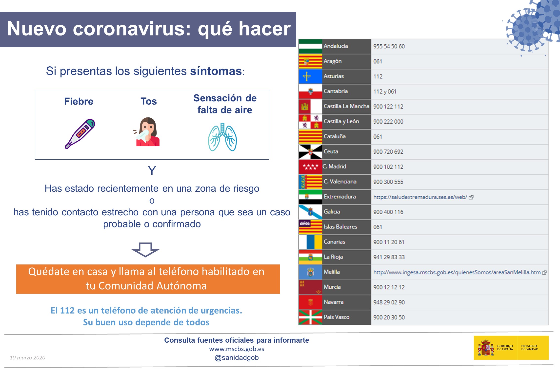 La Consejería de Sanidad recomienda contactar con el teléfono único de emergencias 112 ante posibles sospecha de Covid-19.