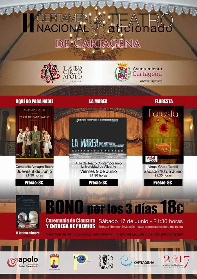 El grupo muleño ALMAGRA Teatro, ha quedado finalista en el Certamen Nacional de Teatro Aficionado de Cartagena, con la obra «Aquí no paga nadie» del premio Nobel Darío Fo. La representación de la obra tendrá lugar el próximo jueves, día 8 de junio, a las 21:30 horas, en el Teatro Circo Apolo de El Algar de Cartagena.