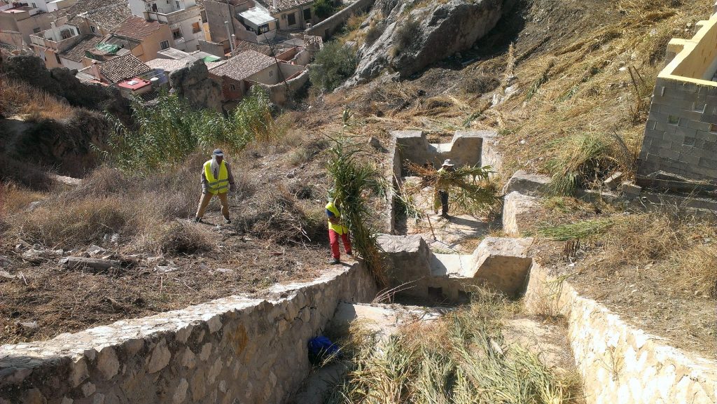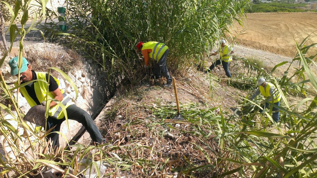 1.- Limpieza y acondicionamiento de barrancos, cunetas, diques y drenajes: Para combatir las inundaciones y arrastres que provocan las lluvias otoñales, se está procediendo a la limpieza y retirada de maleza y depósitos de sedimentos en barrancos, cunetas, acequias, diques, sistemas de captación de aguas y zonas de escorrentías superficiales, localizadas especialmente en las zonas de la Fuensanta, la Fuensoriana, Cañada del Hambre y Altos de Santo Domingo.
