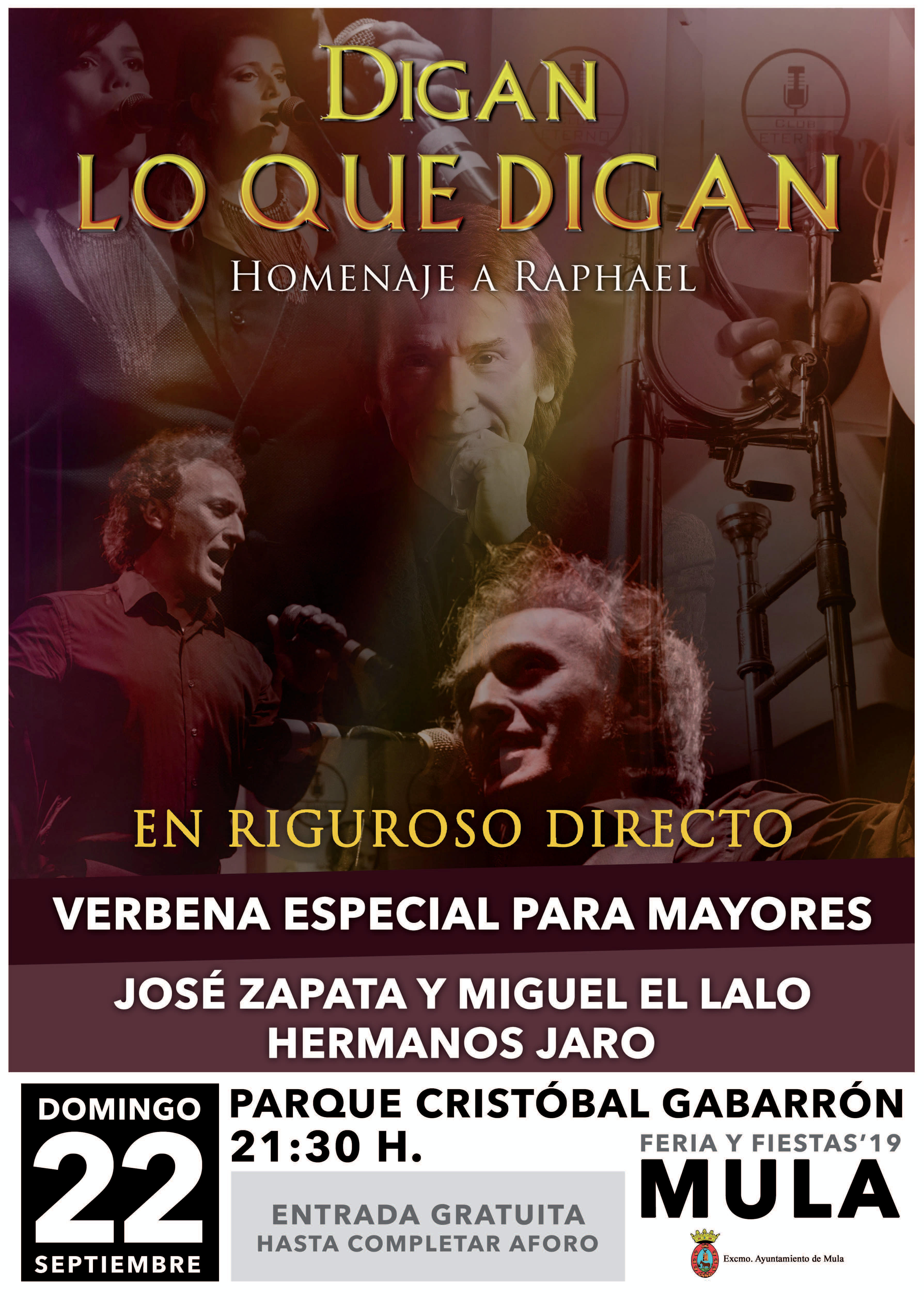 A las 21.30 horas, Parque Cristóbal Gabarrón, Verbena especial para los Mayores, actuación de JOSÉ ZAPATA Y MIGUEL EL LALO, y seguidamente HERMANOS JARO. Entrega de premios de los concursos celebrados.