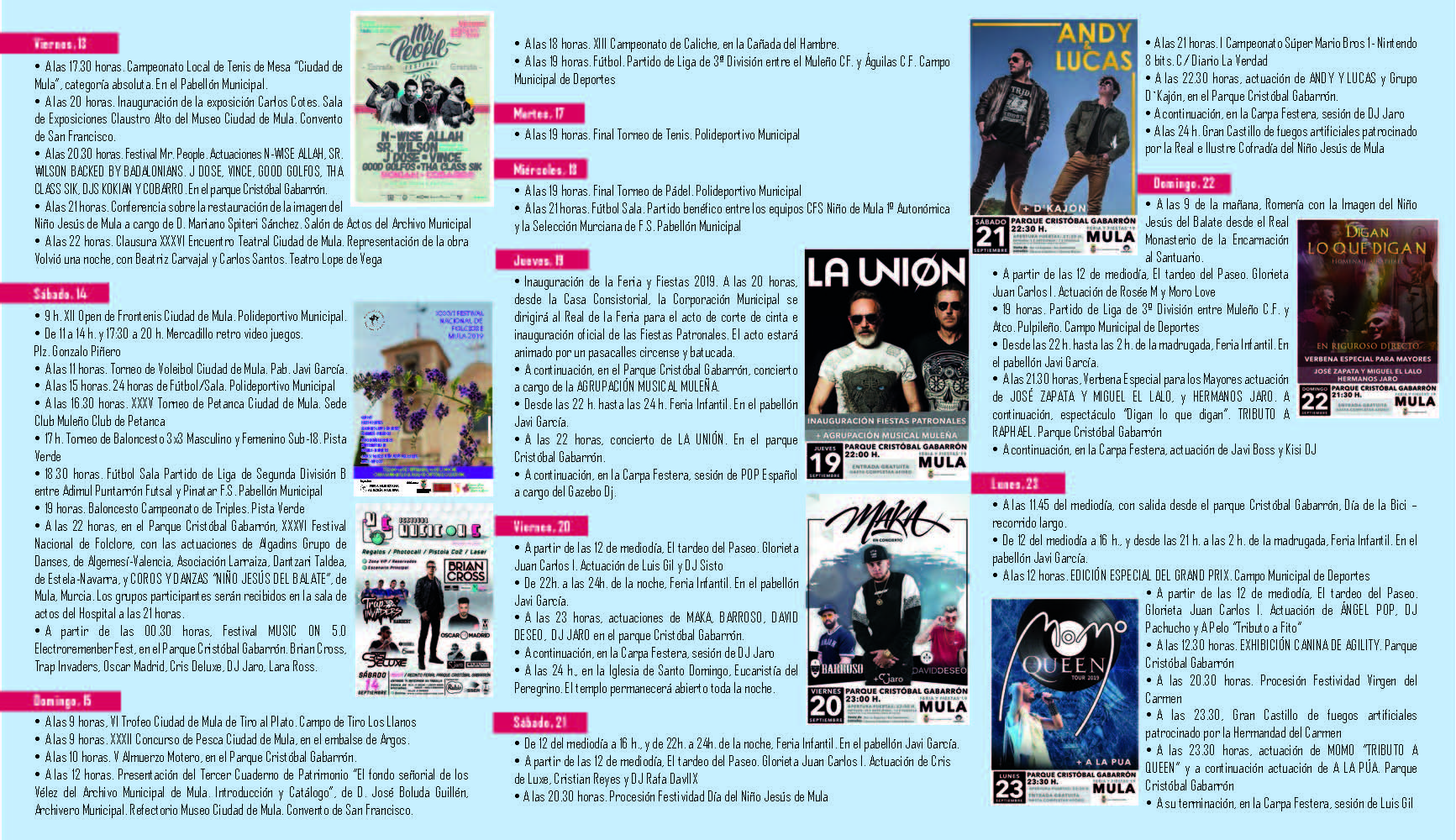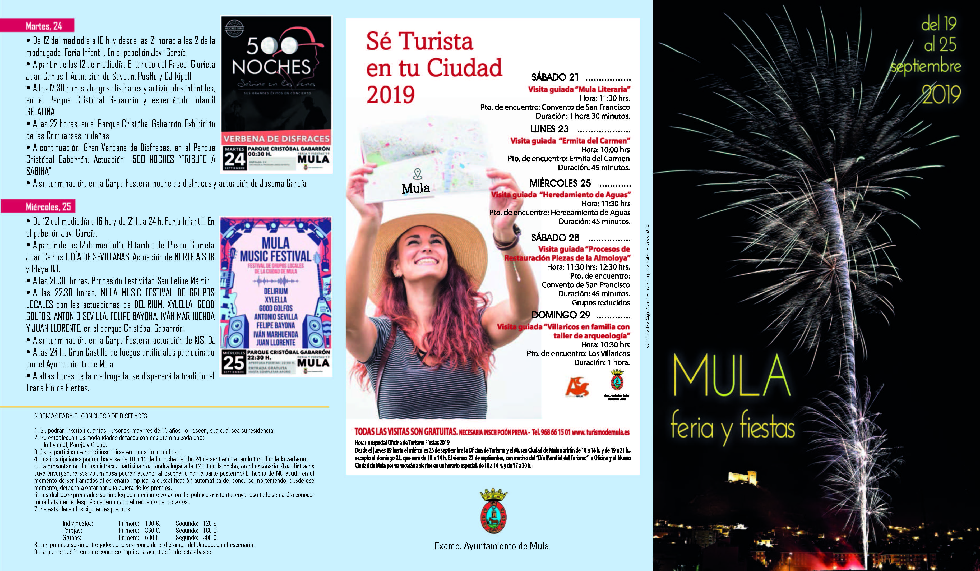 Desde el jueves 19 hasta el miércoles 25 de septiembre la Oficina de Turismo y el Museo Ciudad de Mula abrirán de 10 a 14 horas y de 19 a 21 horas, excepto domingo 22, de 10 a 14 horas.