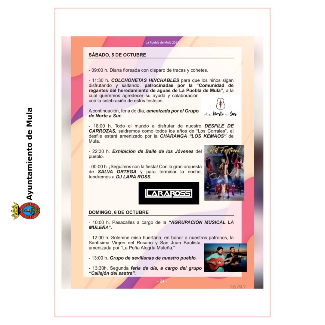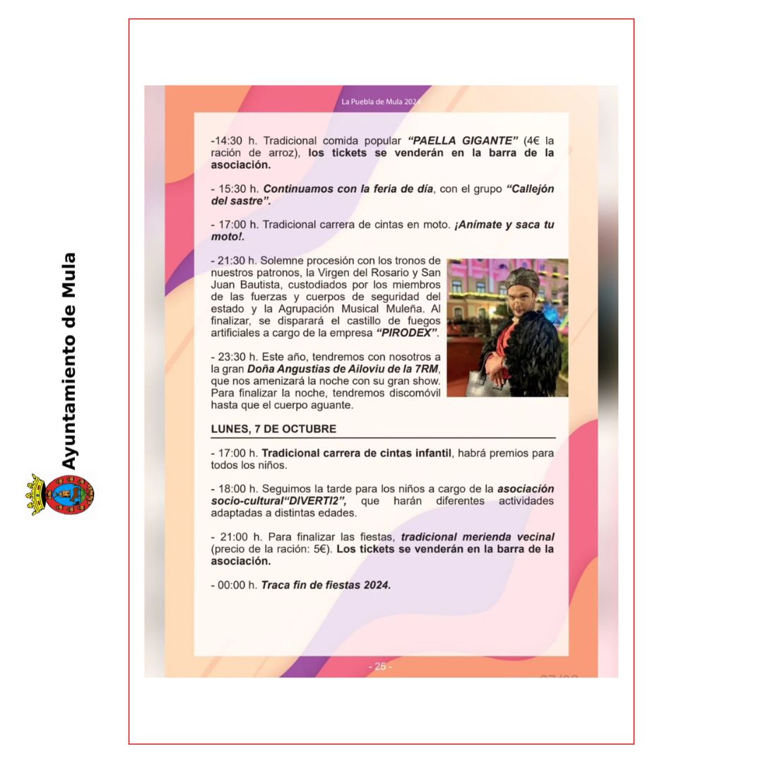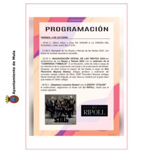 La Puebla de Mula, 4 de octubre de 2024 – El Ayuntamiento de Mula felicita a todos los vecinos y vecinas de La Puebla de Mula por el inicio de sus Fiestas Patronales 2024, una celebración llena de tradición, alegría y actividades para todas las edades.