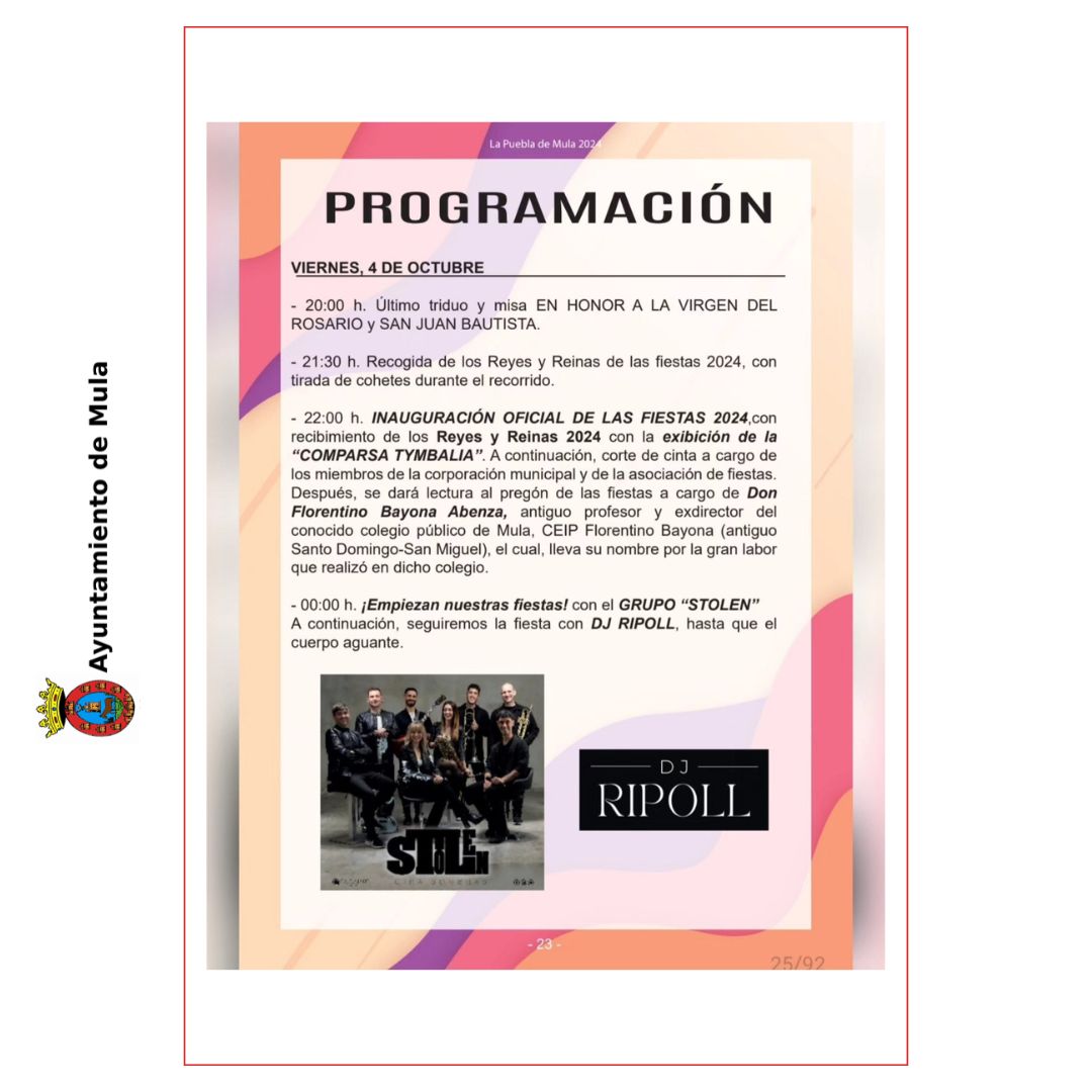 Este viernes 4 de octubre se dará el pistoletazo de salida con el acto de inauguración oficial de las fiestas, que contará con la recogida de los Reyes y Reinas 2024 y una exhibición de la “Comparsa Tymbalia”. El pregón correrá a cargo de Florentino Bayona Abenza, antiguo profesor y director del conocido colegio público de Mula, CEIP Florentino Bayona. Posteriormente, comenzarán los actos festivos con música en directo a cargo del Grupo “Stolen” y DJ Ripoll, que animarán la noche hasta altas horas.