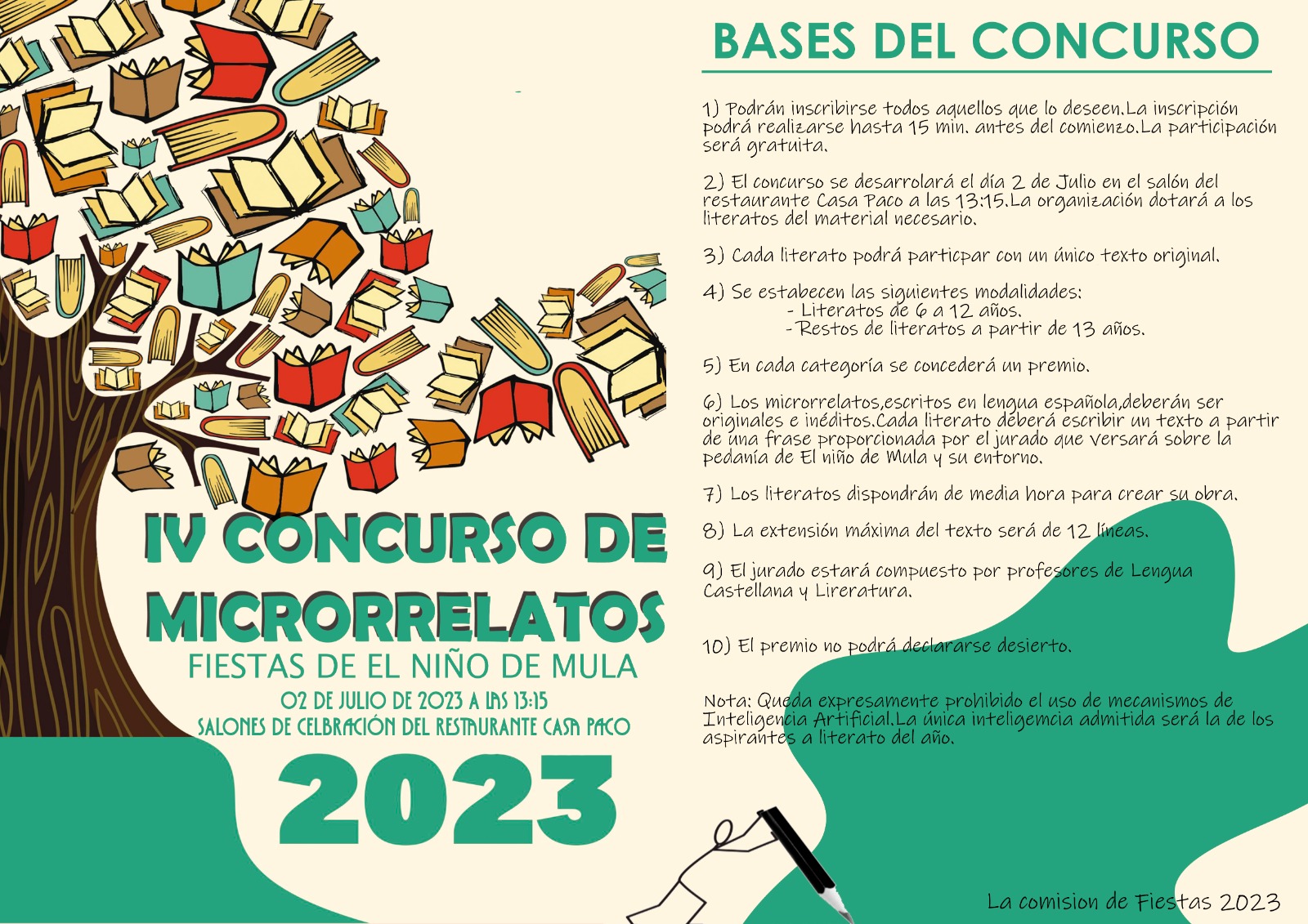 El IV Concurso de Microrrelatos Fiestas de el Niño de Mula se realiza el domingo, 2 de julio, a las 13:15 horas, en Salones de Celebración del Restaurante Casa Paco. Puede inscribirse cualquier persona que lo desee hasta 15 minutos antes del comienzo, siendo la participación totalmente gratuita.