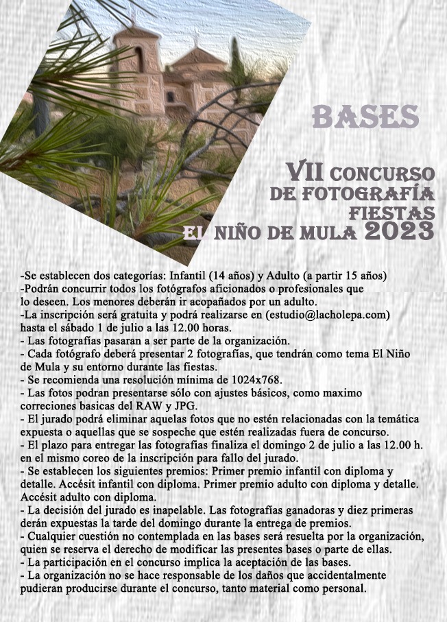 Las inscripciones para el VII Concurso de Fotografía Fiestas de El Niño de Mula están abiertas hasta el sábado, 1 de julio, a las 12 horas, a través del correo estudio@lacholepa.com. Pueden participar tanto aficionados como fotógrafos profesionales.