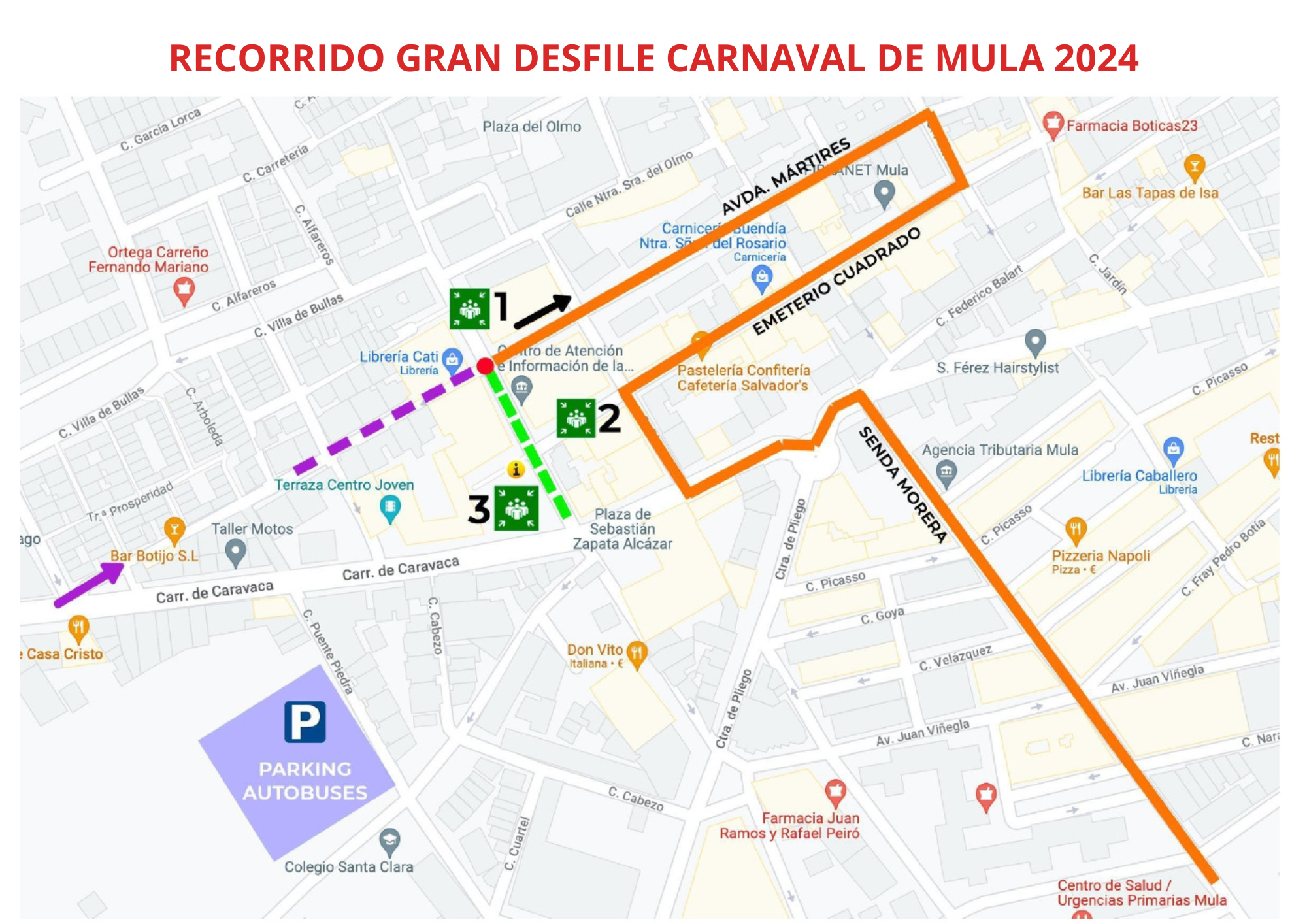 Este sábado, 10 de febrero, Mula celebra su Gran Desfile de Carnaval a partir de las 18 horas, saliendo desde la avenida de los Mártires, pasando por las calles Pintor, Emeterio Cuadrado, del Olmo, Carretera de Caravaca, Senda de la Morera y finalizando a los alrededores del Centro de Salud. En el mismo participarán las comparsas seleccionadas en el Concurso de comparsas foráneas, cuya entrega de premios se hará tras terminar el desfile, a las 22 horas, en la Pista Verde.