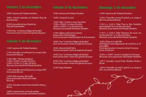 El arranque oficial del poblado tendrá lugar el viernes 5 de diciembre, con la apertura del recinto a las 18:00 h, el cuentacuentos “Cuentos invernales por Navidad” a las 19:00 h en la Plaza del Ayuntamiento y, más tarde, el encendido de luces navideñas en el mismo enclave. A continuación, comenzará el primer pase del espectáculo “La Aventura Mágica de Navidad”, el gran espectáculo itinerante que recorrerá el Paseo durante todo el puente.