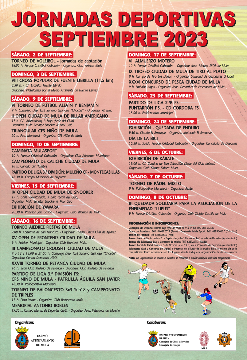 El deporte también será protagonista en la Feria y Fiestas de Mula 2023 con sus XXXX Jornadas Deportivas de Septiembre, con torneos de voleibol, fútbol, tenis, ajedrez, entre otros, organizados por distintos clubes deportivos del municipio.