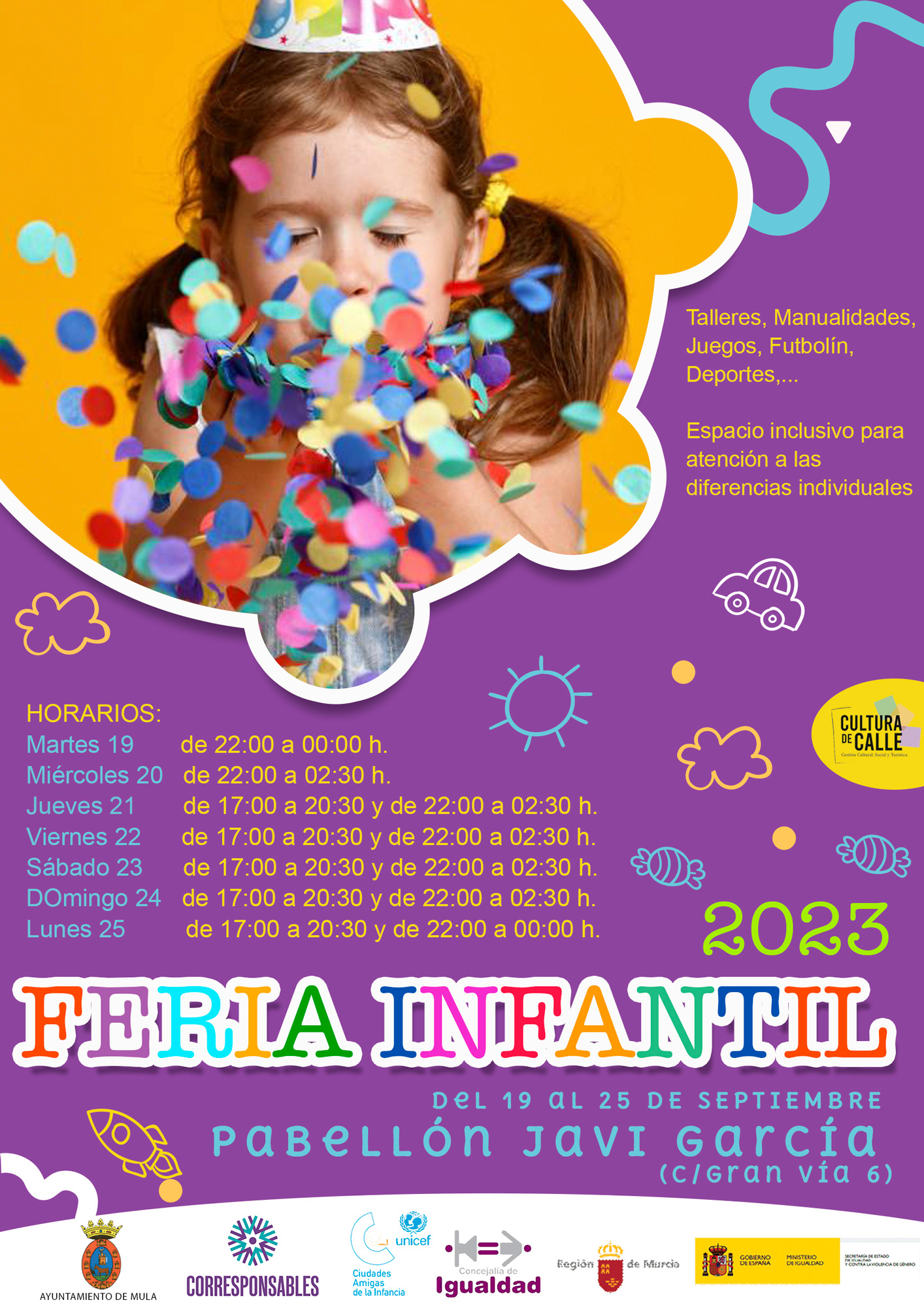 Los más pequeños podrán divertirse con hinchables y la disponibilidad de una Ludoteca, donde podrán divertirse y disfrutar de las fiestas a la vez que se facilita la conciliación familiar. En este sentido, la Concejalía de Igualdad instalará Puntos Violetas en el parque Cristóbal Gabarrón y Mula Deportiva José Soriano Chacón, para unas fiestas libres de violencias machistas.