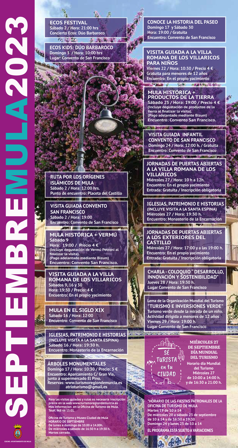 Dentro de la programación también destacan las visitas guiadas organizadas por la Concejalía de Turismo, a través del ciclo Sé turista en tu ciudad, donde pequeños y mayores podrán disfrutar de diversos rincones del municipio y redescubrir su tierra. Para cualquier información, pueden contactar con la Oficina de Turismo de Mula.
