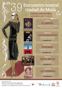 Sin embargo, desde el 11 de septiembre, los ciudadanos podrán disfrutar de una oferta cultural amplia con motivo de la festividad gracias al XXXIX Encuentro Teatral Ciudad de Mula, que trae a la ciudad cinco obras teatrales, como El crédito, Los anunciantes o ¡Ay, Carmela! Las actuaciones, enmarcadas dentro del Plan MurmurArte del Instituto de las Industrias Culturales y las Artes de la Región (ICA), se celebrarán en el Teatro Lope de Vega y sus entradas podrán adquirirse en la web del Ayuntamiento de Mula de forma individual o en la Oficina de Turismo, si se desea adquirir un abono para verlas todas.