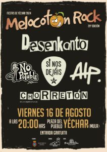 - 20:00 h: XXIX Edición Melocotón Rock con Chorretón, Desenkanto, No Potable, Si nos Dejan y el grupo local ALAPUA.