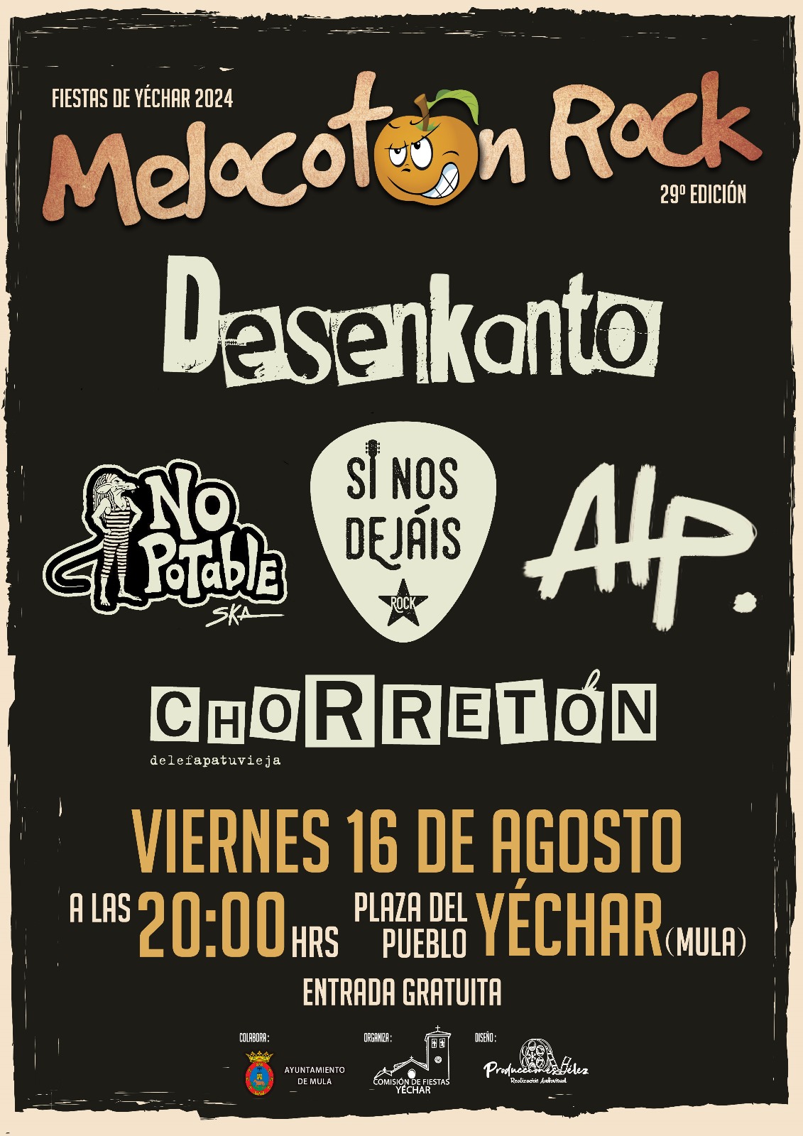 - 20:00 h: XXIX Edición Melocotón Rock con Chorretón, Desenkanto, No Potable, Si nos Dejan y el grupo local ALAPUA.