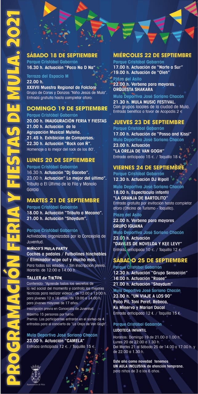 Del Martes 21 al Sábado 25 de 14:00 a 17:00 h. y de 22:00 a 1:30 h.