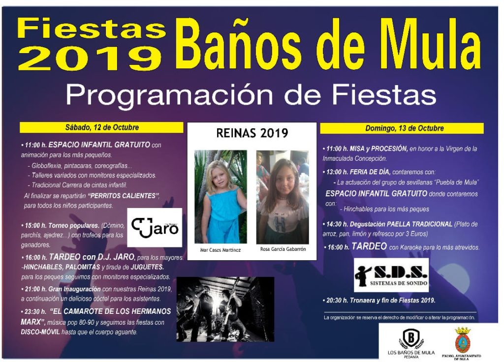 View Larger Image Fiestas de los Baños de Mula – 12 y 13 de octubre Comparte esto: Comparte en Facebook (Se abre en una ventana nueva) Facebook Compartir en X (Se abre en una ventana nueva) X Compartir en Telegram (Se abre en una ventana nueva) Telegram Compartir en WhatsApp (Se abre en una ventana nueva) WhatsApp Imprimir (Se abre en una ventana nueva) Imprimir Rosario Martínez2021-05-12T20:11:07+02:00jueves, 10 octubre 2019|festejos, pedanías|