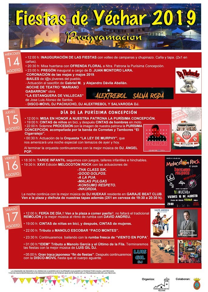 View Larger Image Fiestas de Yéchar – del 14 al 17 de agosto Comparte esto: Comparte en Facebook (Se abre en una ventana nueva) Facebook Compartir en X (Se abre en una ventana nueva) X Compartir en Telegram (Se abre en una ventana nueva) Telegram Compartir en WhatsApp (Se abre en una ventana nueva) WhatsApp Imprimir (Se abre en una ventana nueva) Imprimir Rosario Martínez2021-05-12T20:11:37+02:00viernes, 9 agosto 2019|fiestas, pedanías|