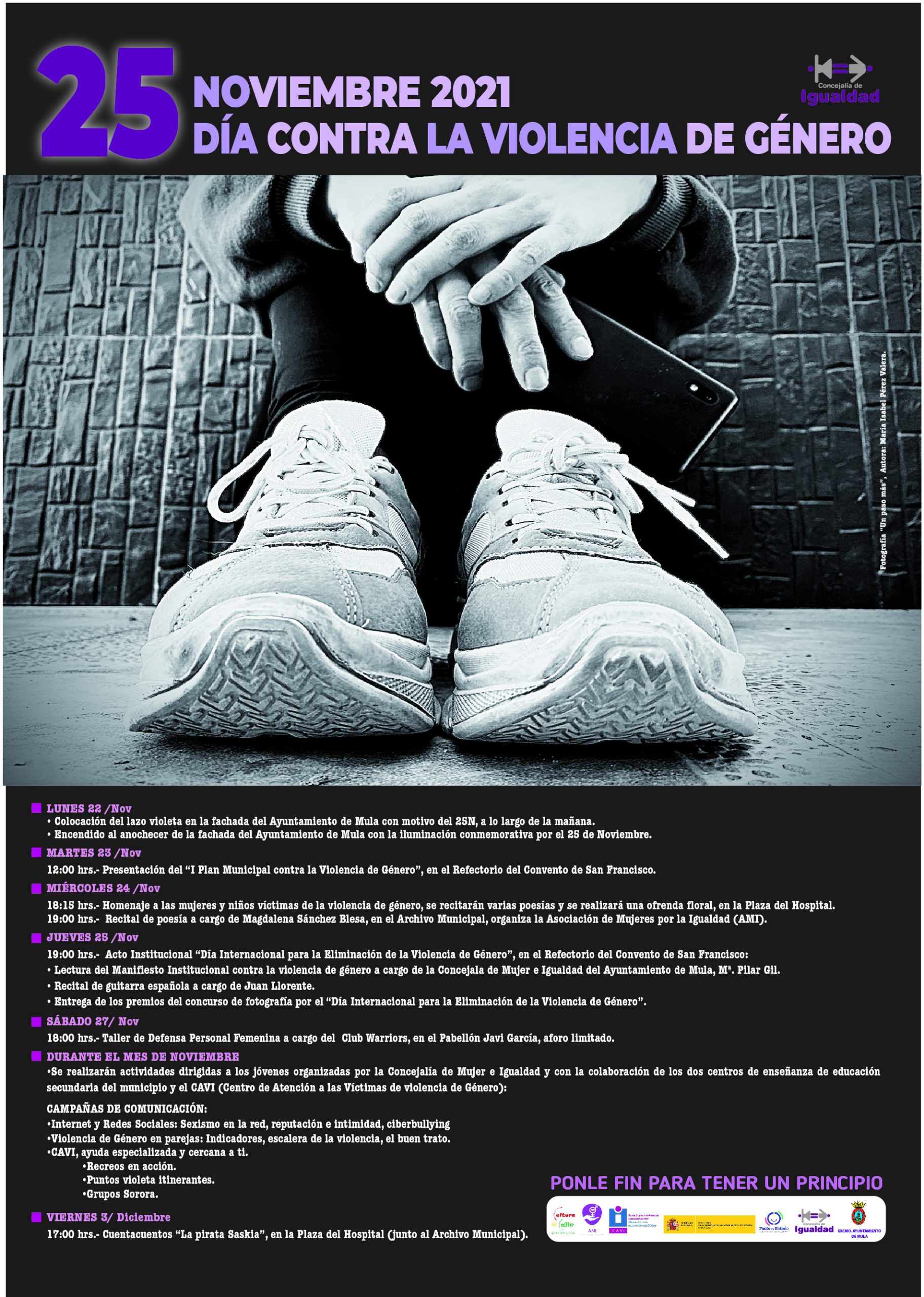 La concejalía de Mujer e Igualdad del Ayuntamiento de Mula organiza, con motivo de la conmemoración del Día Internacional para la Eliminación de la Violencia de Género el próximo 25 de noviembre, diversas actividades para concienciar y seguir dando visibilidad a este grave problema.