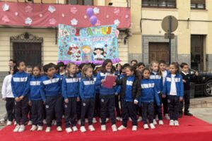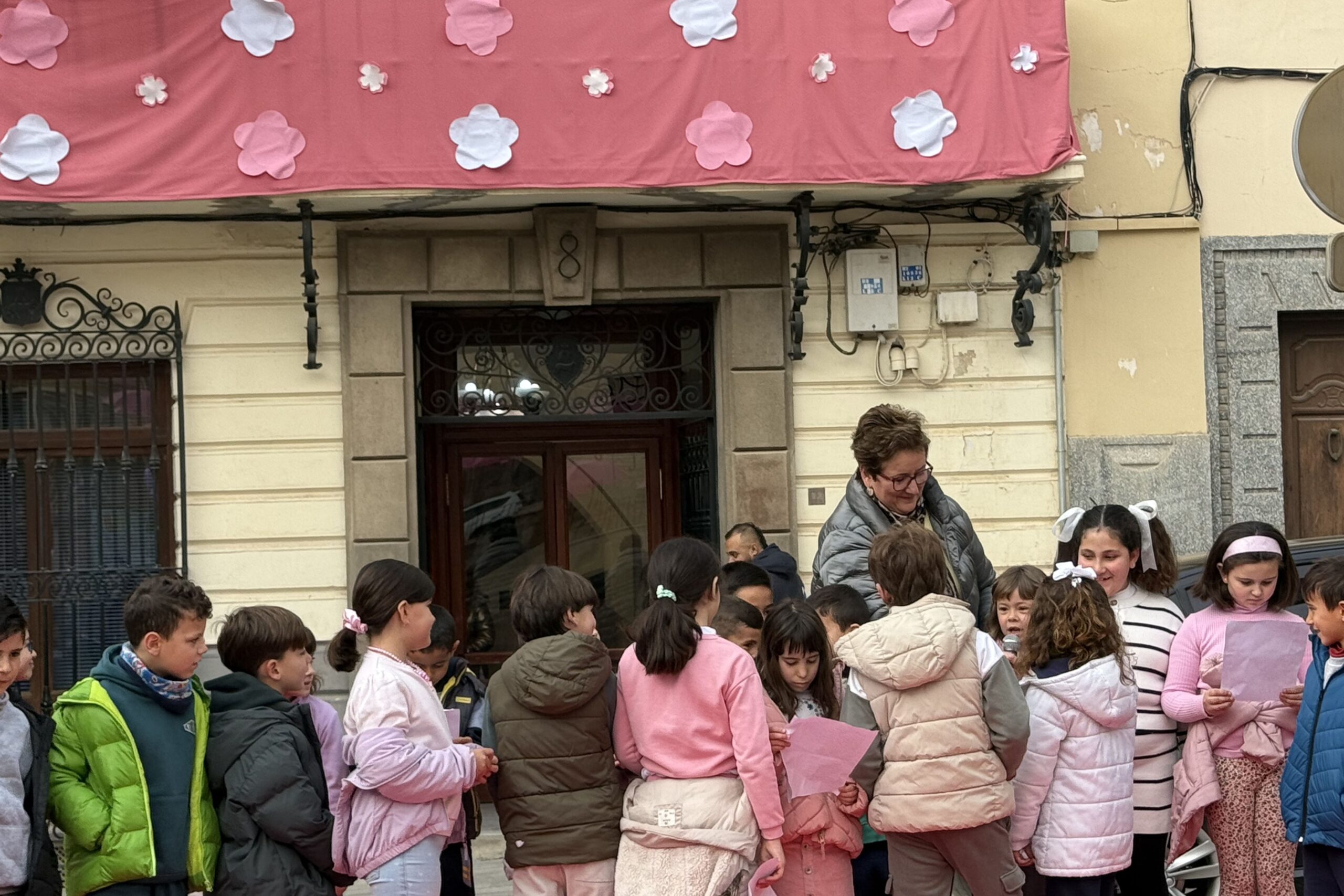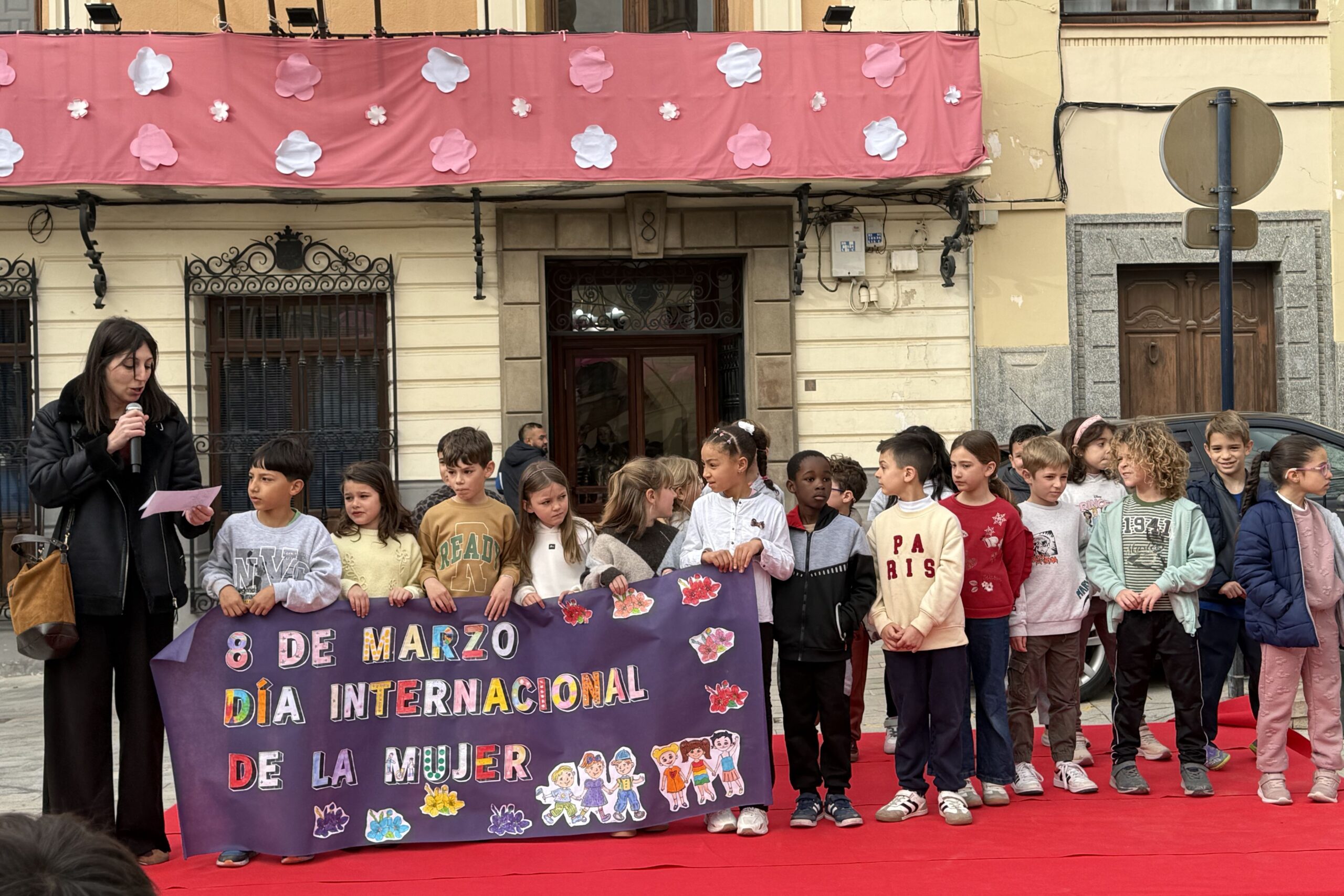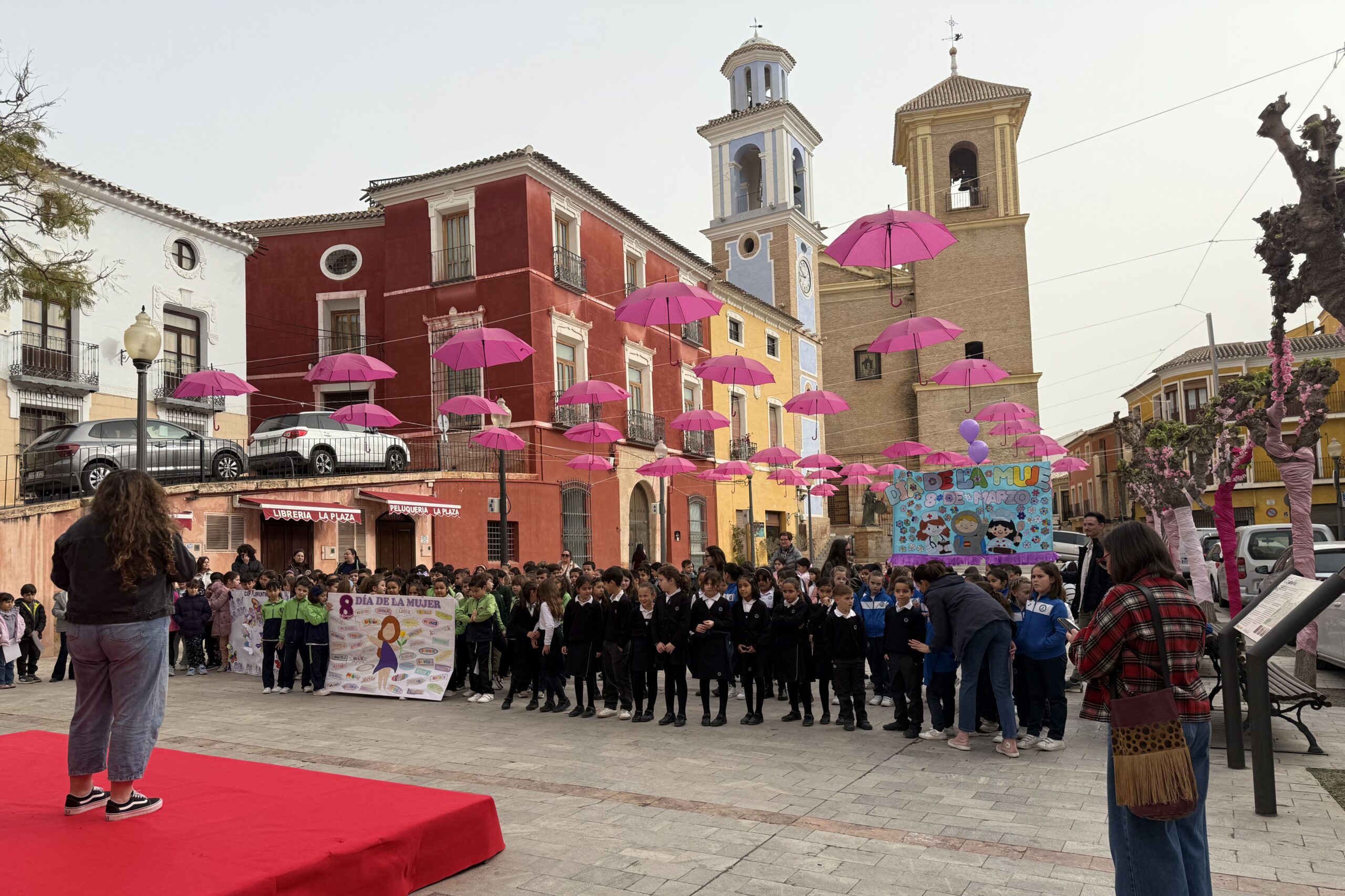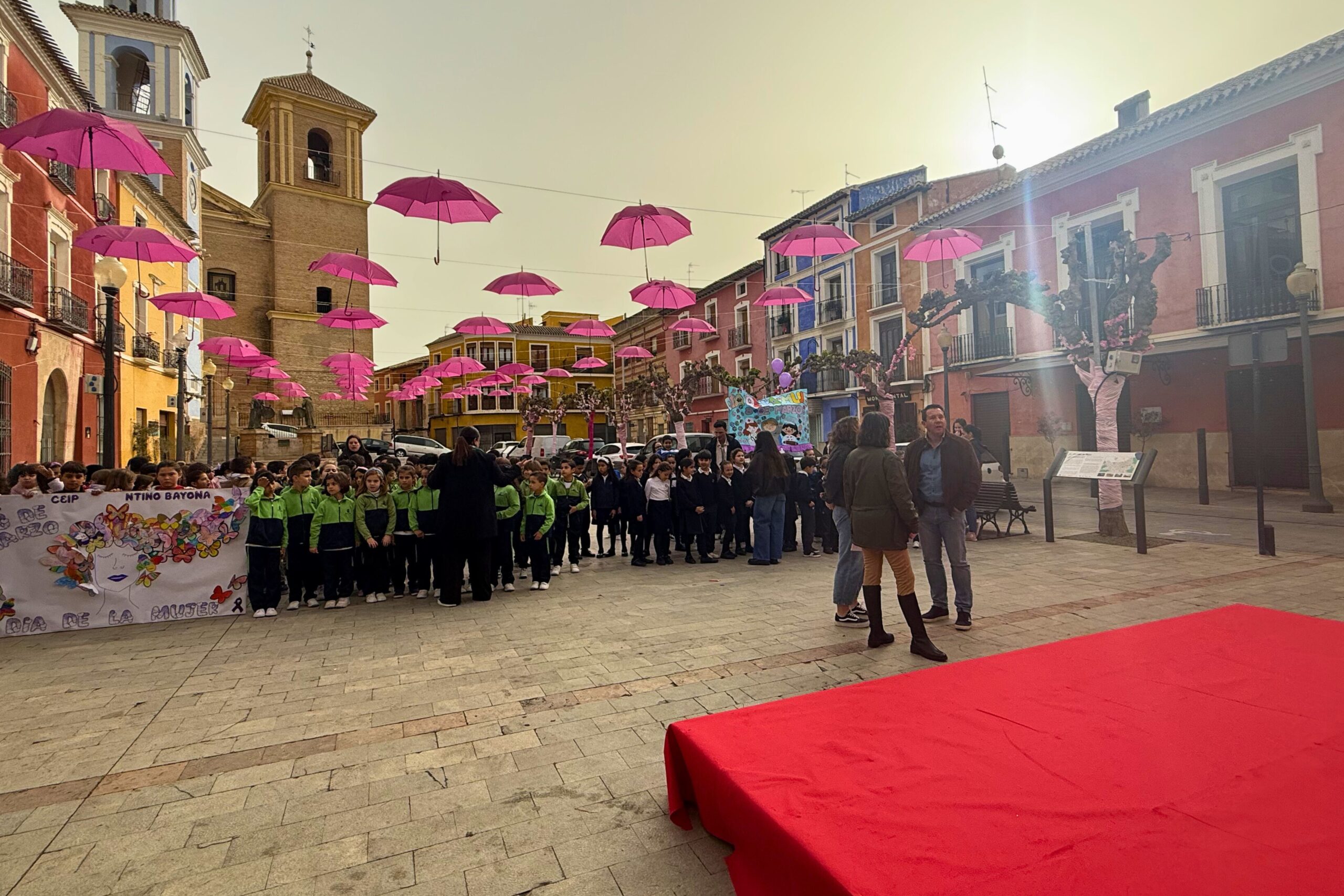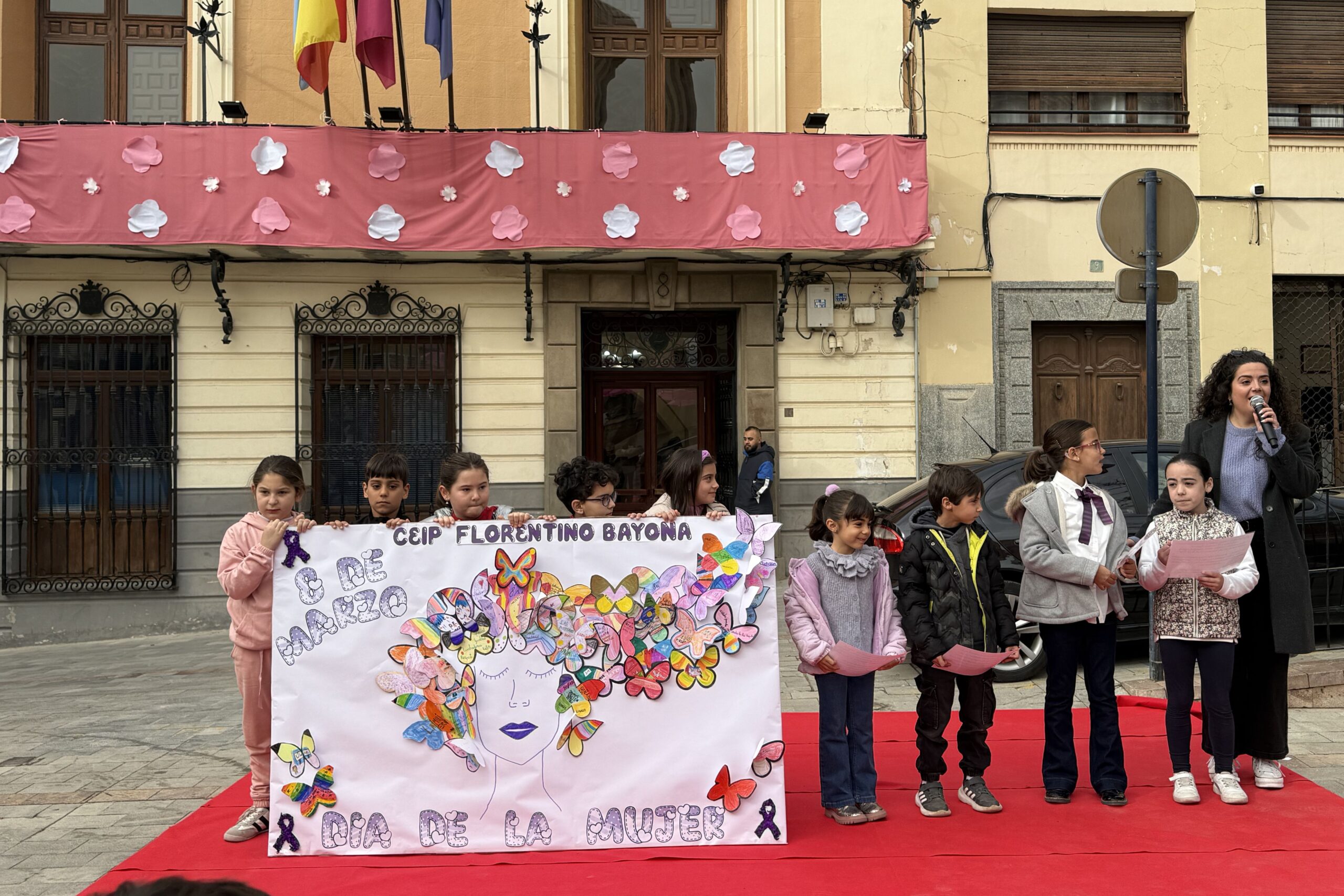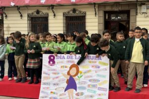 La Plaza del Ayuntamiento ha acogido hoy la presentación de lecturas y pancartas relacionadas con el 8M, realizada por el alumnado de 2º de Primaria de los centros educativos de Mula, en una actividad que ha convertido una de las zonas más emblemáticas del municipio en un punto de encuentro educativo y de sensibilización en torno a la igualdad.